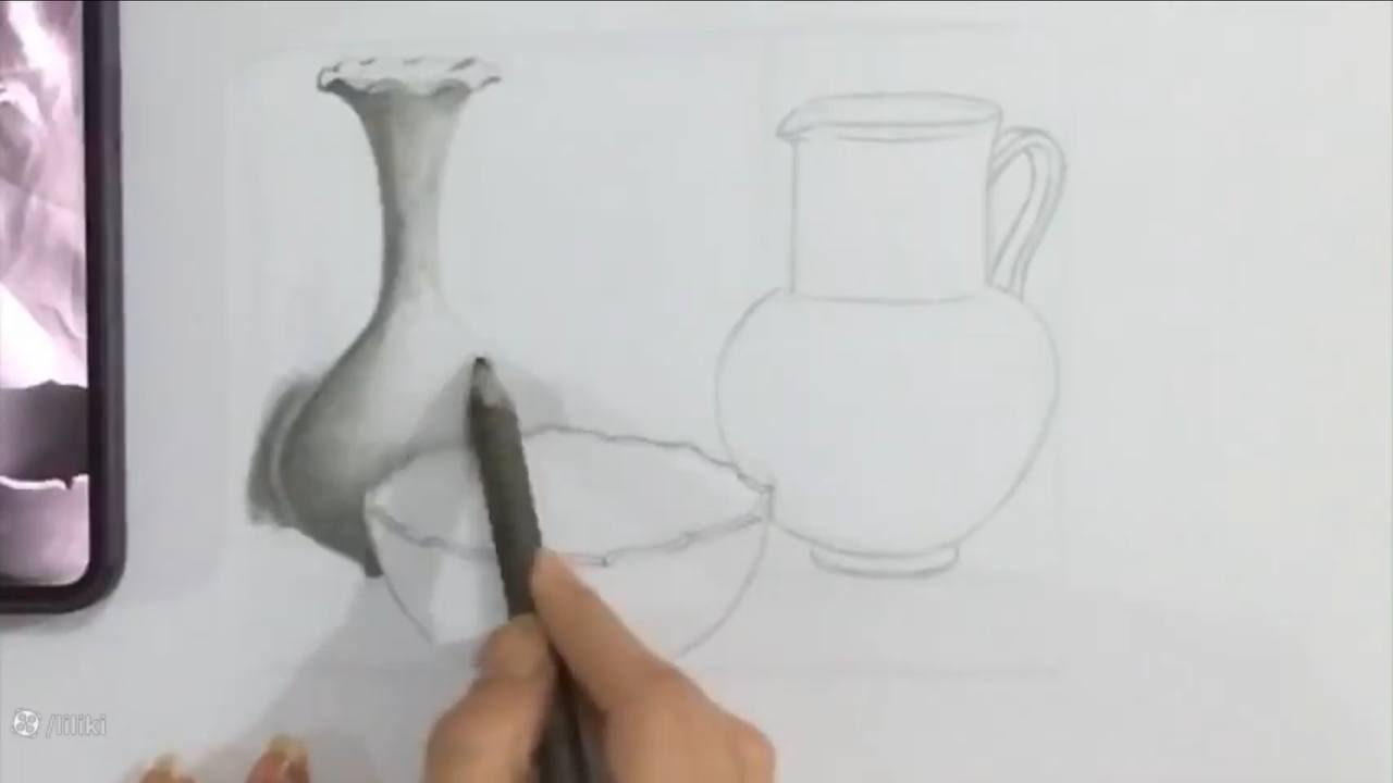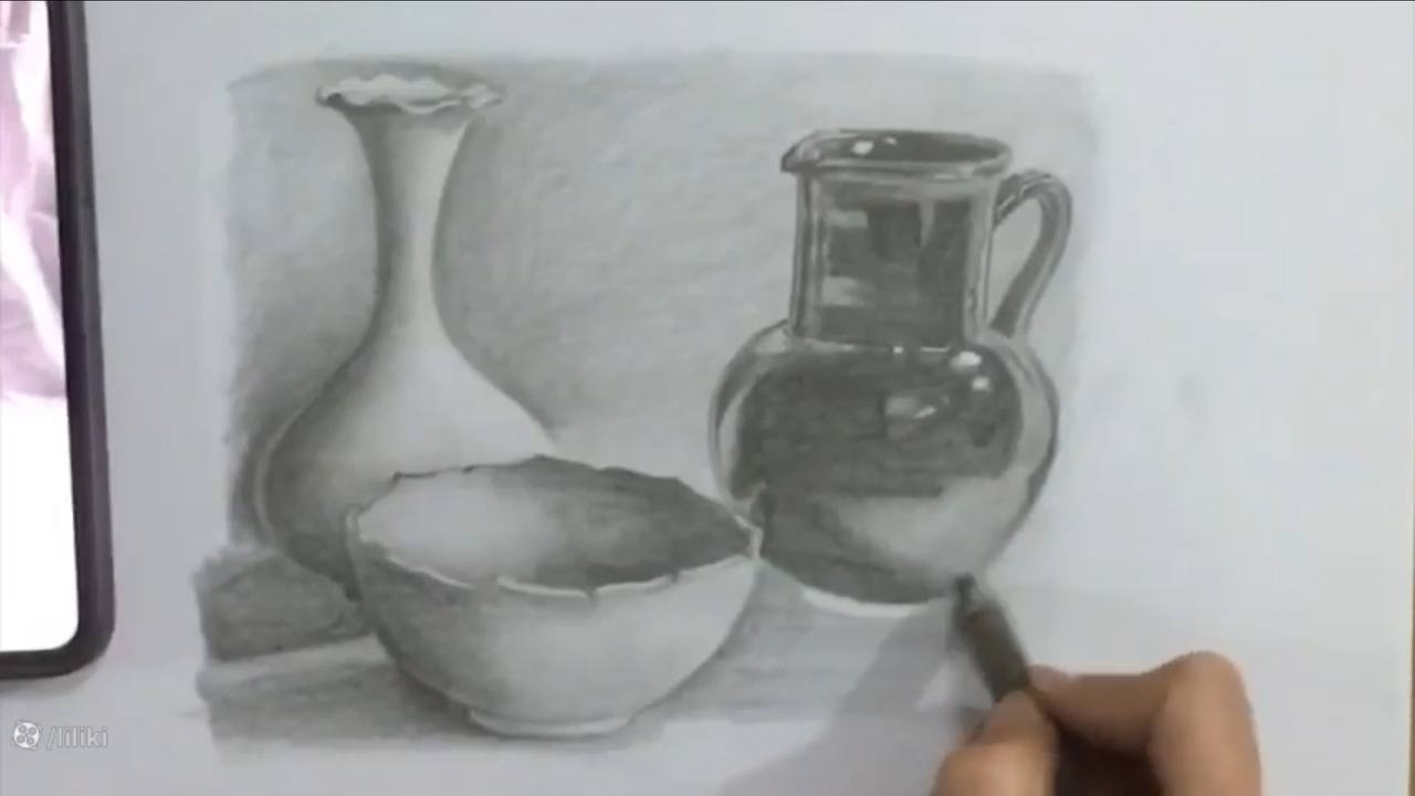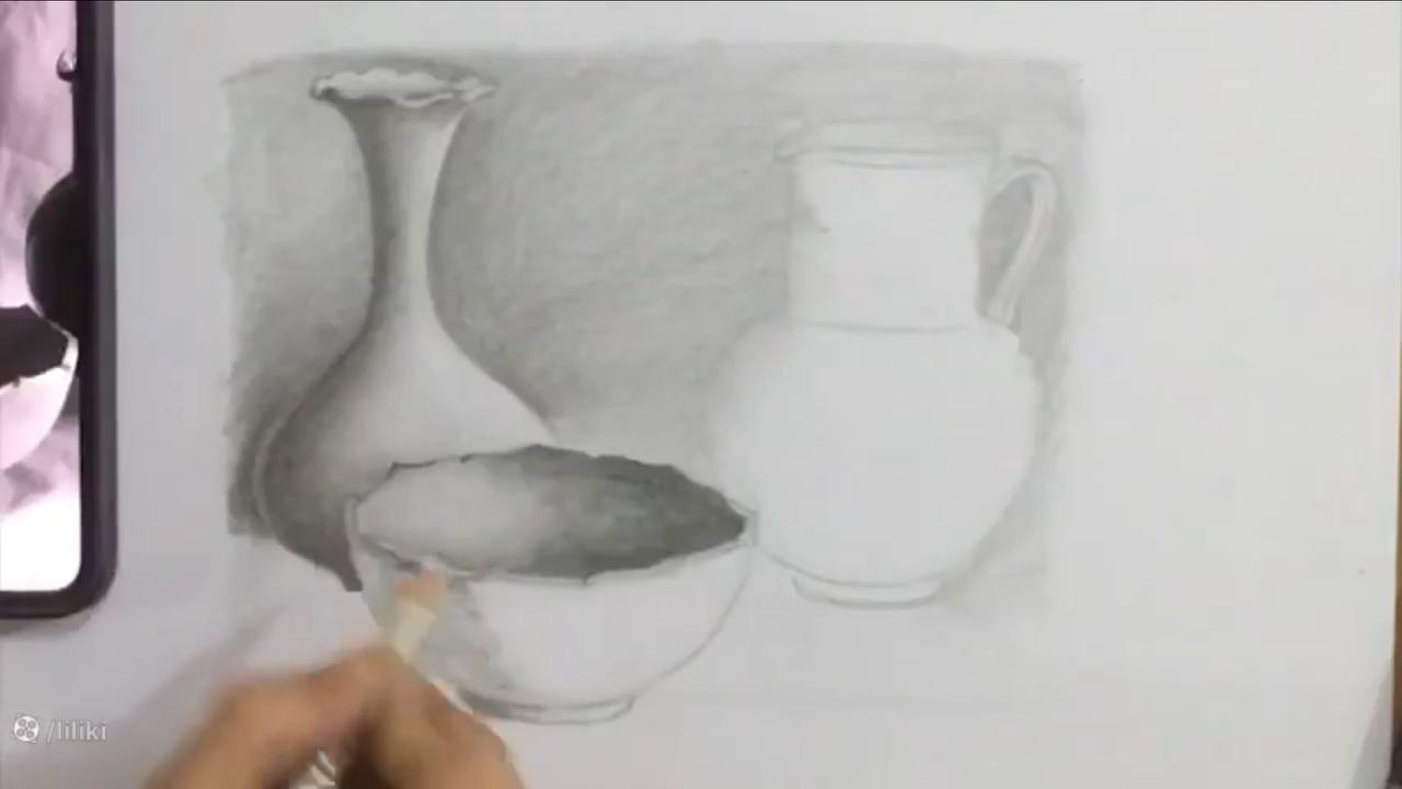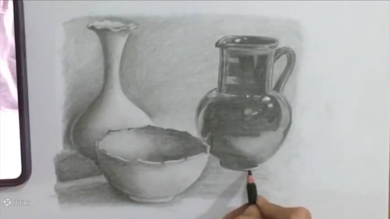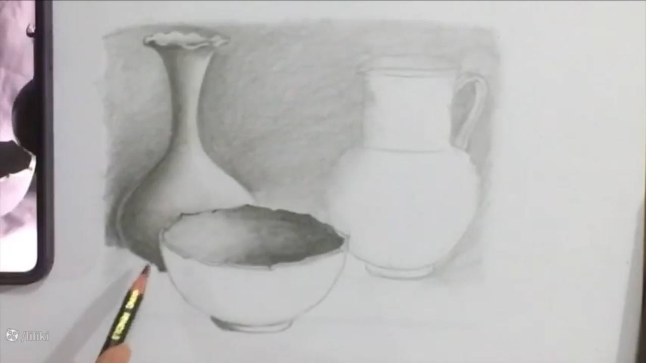 آموزش نقاشی کوزه و لیوان ، ظرف سفالی با مداد سیاه و سایه روشن قسمت دوم