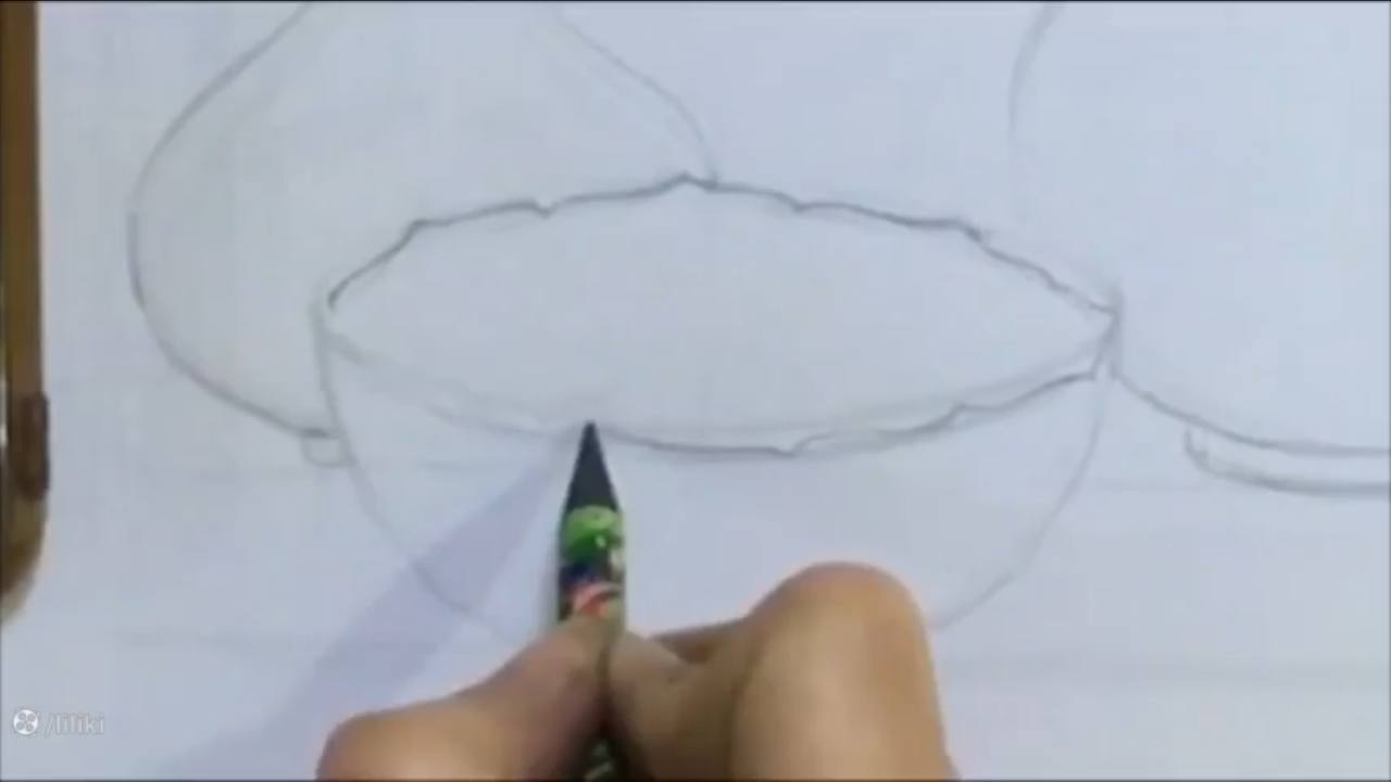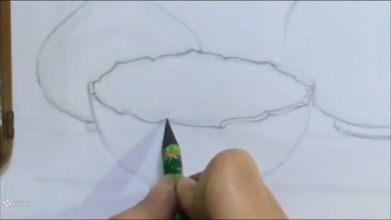 میریم سراغ این کاسه ای که این پایین هست. یک نیم دایره این کاسه تقریبا باید دهانه اش تا اینجا بیاد و یه کوچولو هم جلوی اینه. برای این دو تا یه بیضی خیلی لاغر استفاده کردم. برای این باید یه مقداری تپل تر باشه. بعد خط های اضافی رو پاک می کنیم. بعد از اینکه متوجه شدیم که صد درصد جای هر کدوم رو درست کشیدیم این یکی بیضی.