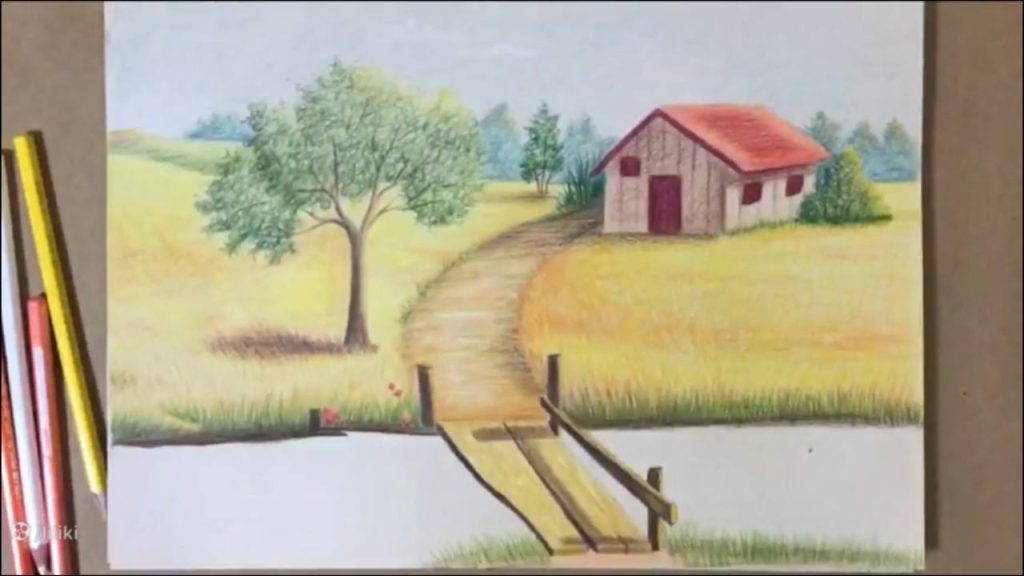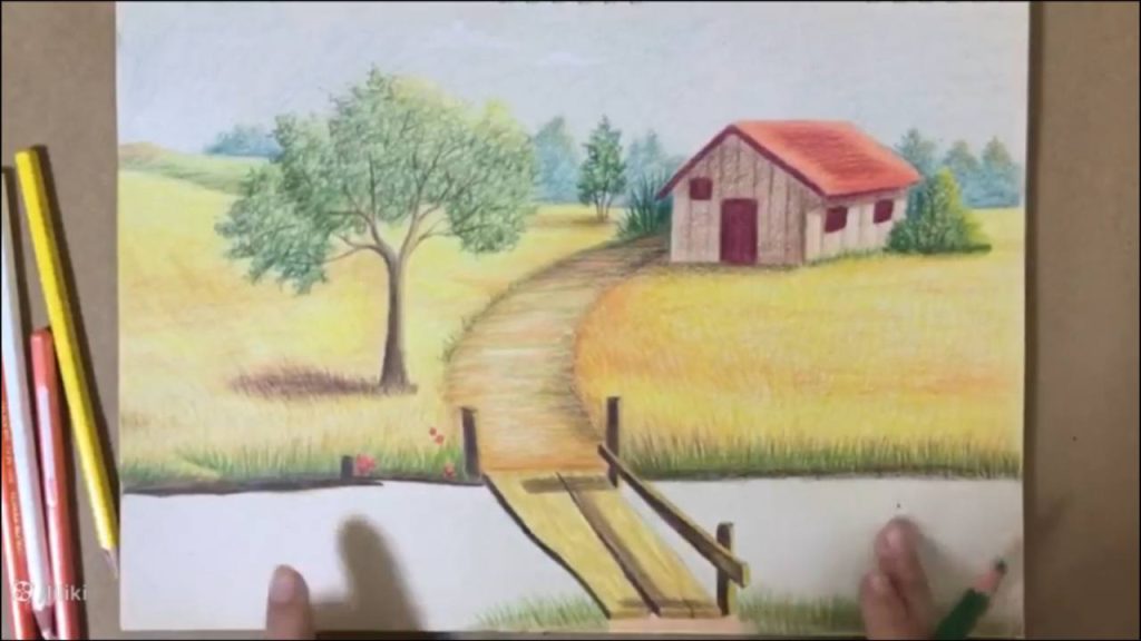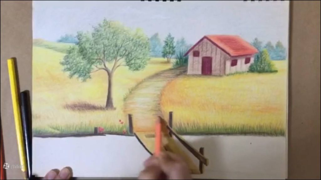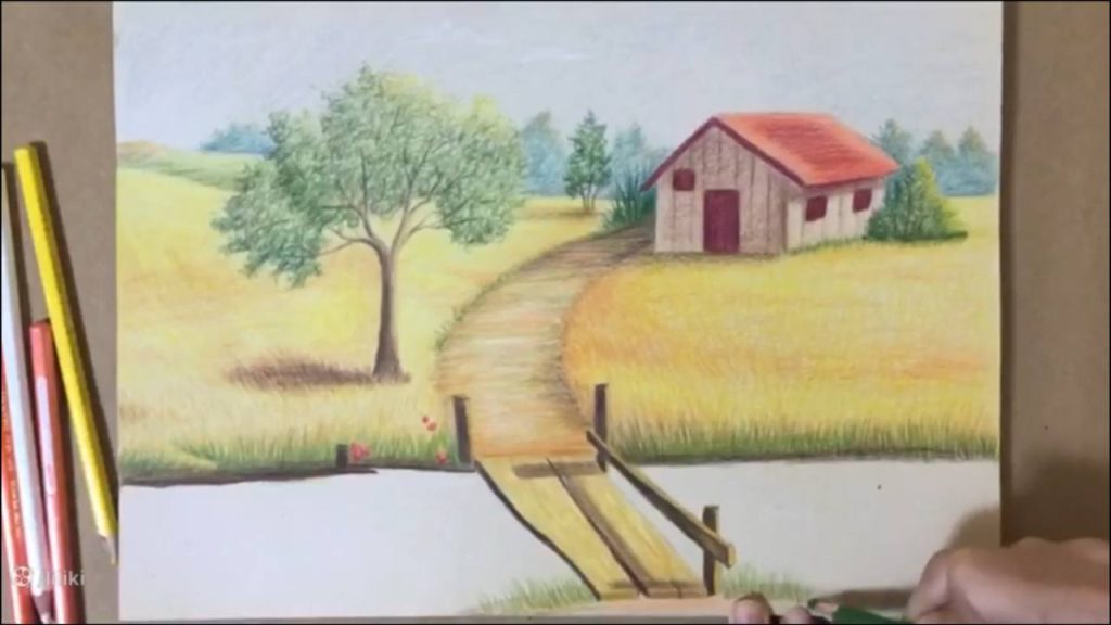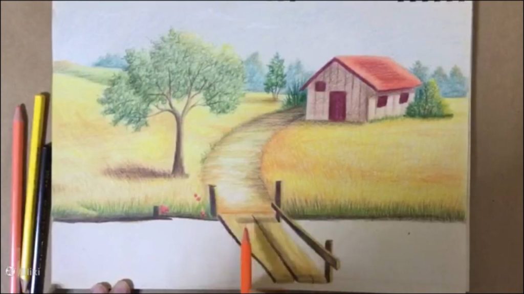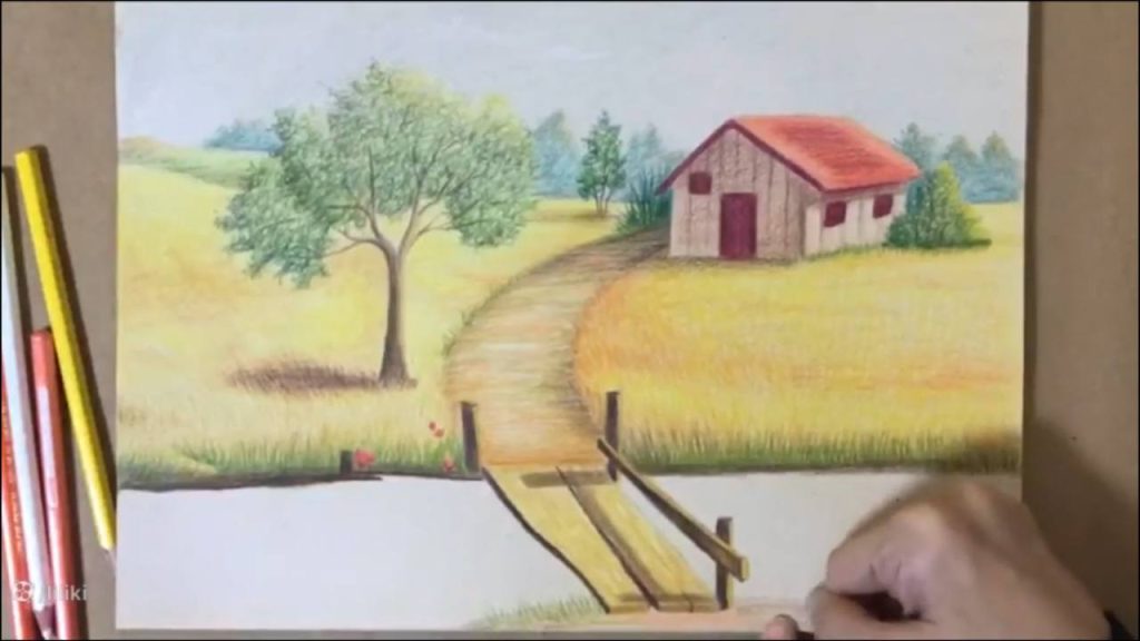 » آموزش نقاشی » آموزش نقاشی حرفه ای منظره با مداد رنگی | نقاشی پل چوبی 7