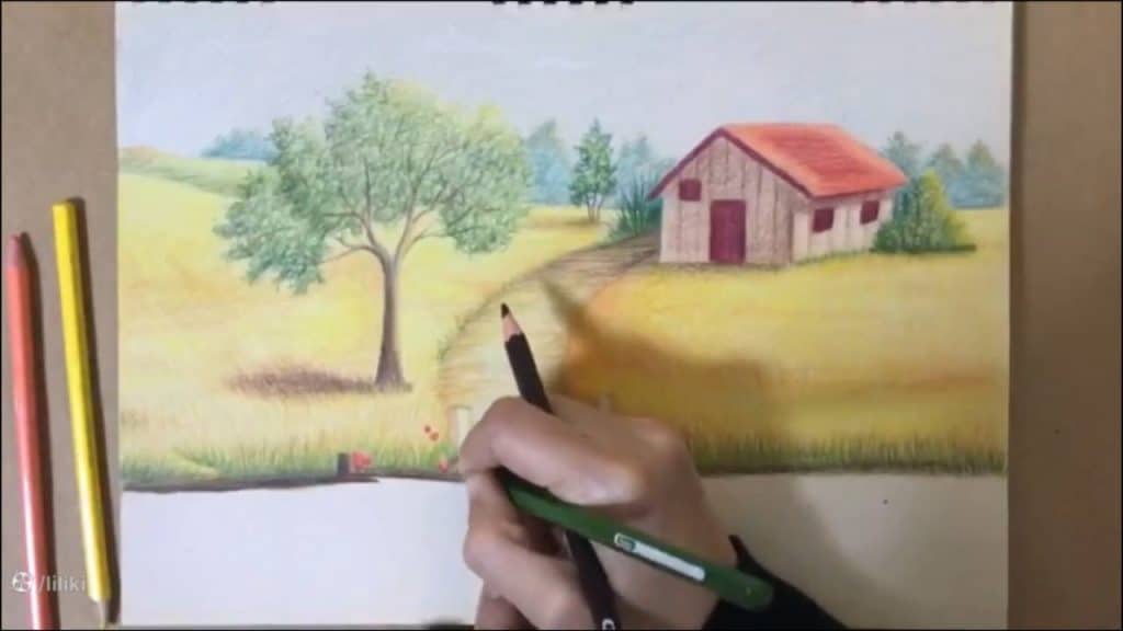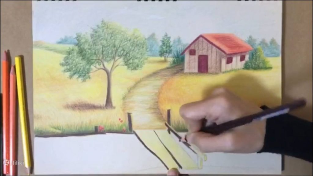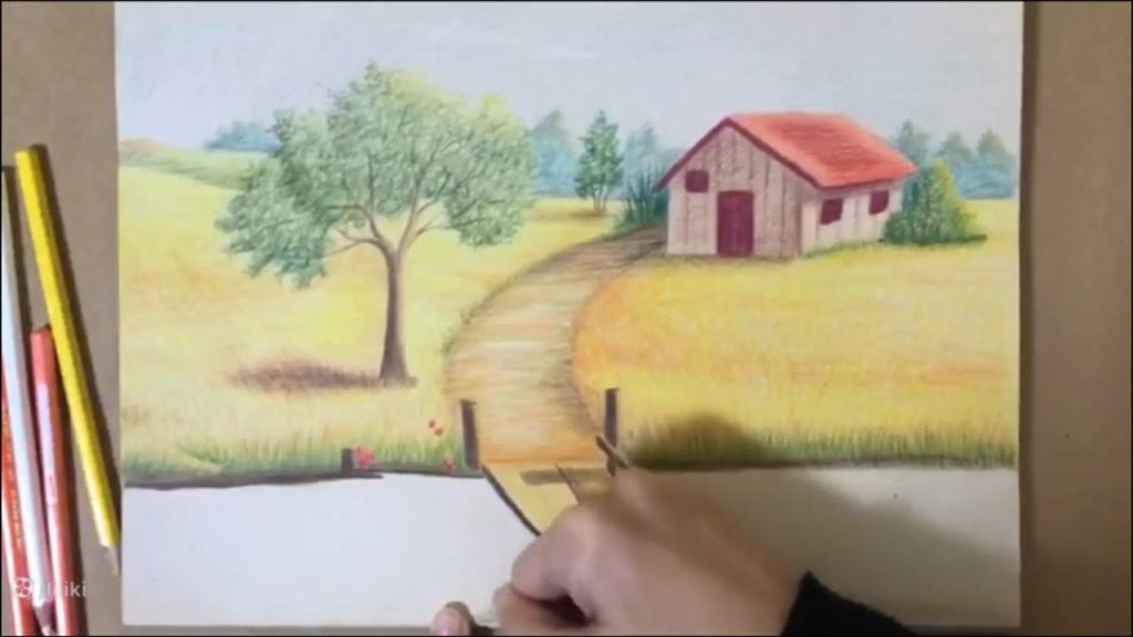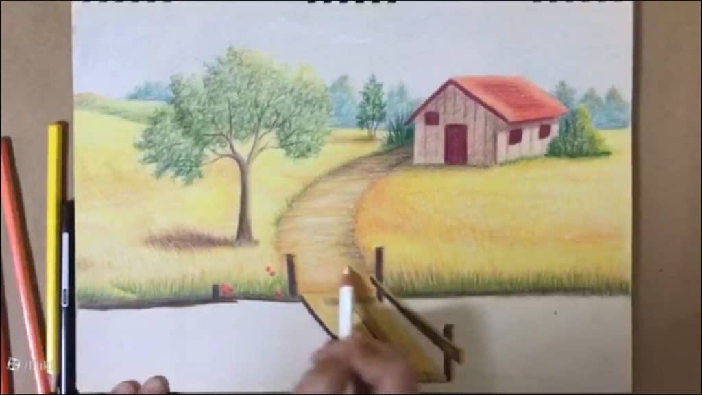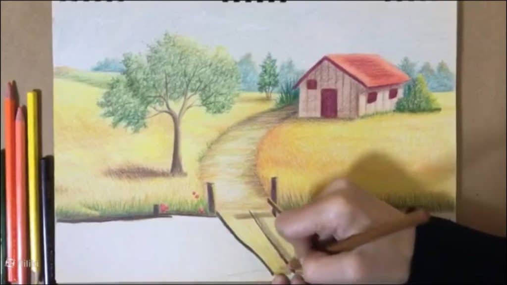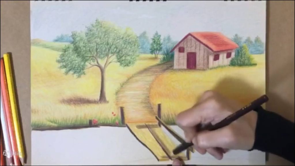 » آموزش نقاشی » آموزش نقاشی حرفه ای منظره با مداد رنگی | نقاشی پل چوبی 7