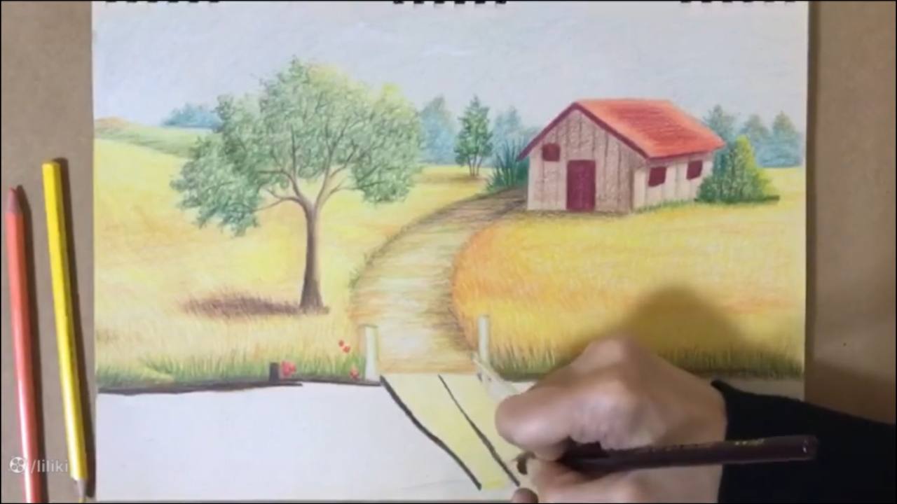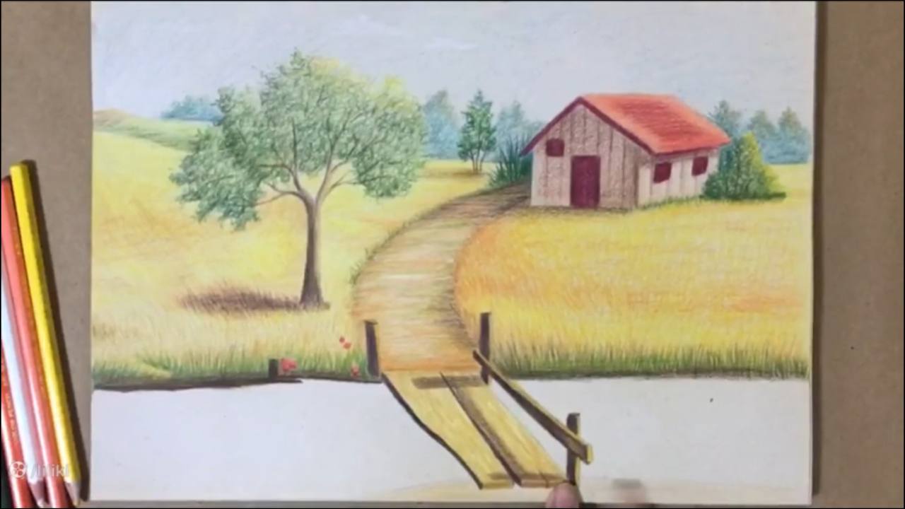 » آموزش نقاشی » آموزش نقاشی حرفه ای منظره با مداد رنگی | نقاشی پل چوبی 7