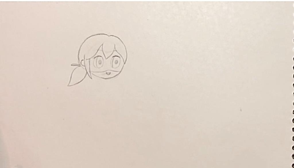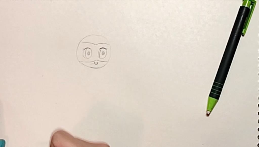 ابتدا یک برای کشیدن صورت یک یک دایره رسم می کنیم. سپس با چهار خط منحنی مطابق شکل نقاب دختر کفشدوزکی را رسم کنید. برای کشیدن چشم ها دایره می کشیم. درون دایره یک هلال می کشیم. برای کشیدن مردمک چشم از دایره توپر استفاده می کنیم و برای لب یک نیم بیضی کوچک می کشیم.