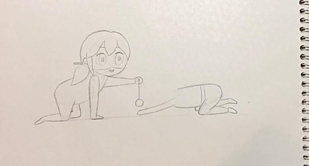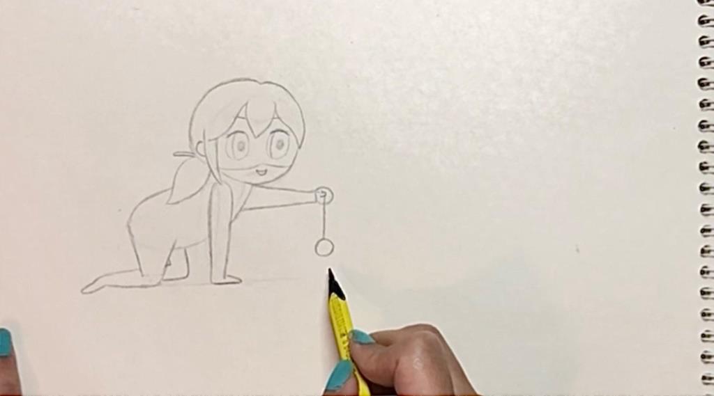 حالا نوبت دست هاست. برای کشیدن بازو راستی یک مستطیل عمودی می کشیم و برای دست یک نیم بیضی. سپس برای بازو چپی از یک مستطیل استفاده می کنیم و هر چه به سمت سر دست نزدیک می شویم فاصله خطوط را کم می کنیم. برای سر دست یک دایره می کشیم. سپس یویو را در دست دختر کفشدوزکی ترسیم می کنیم.