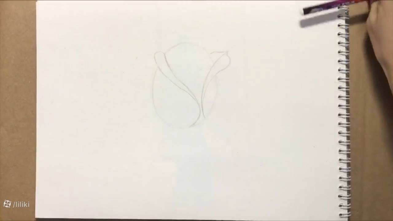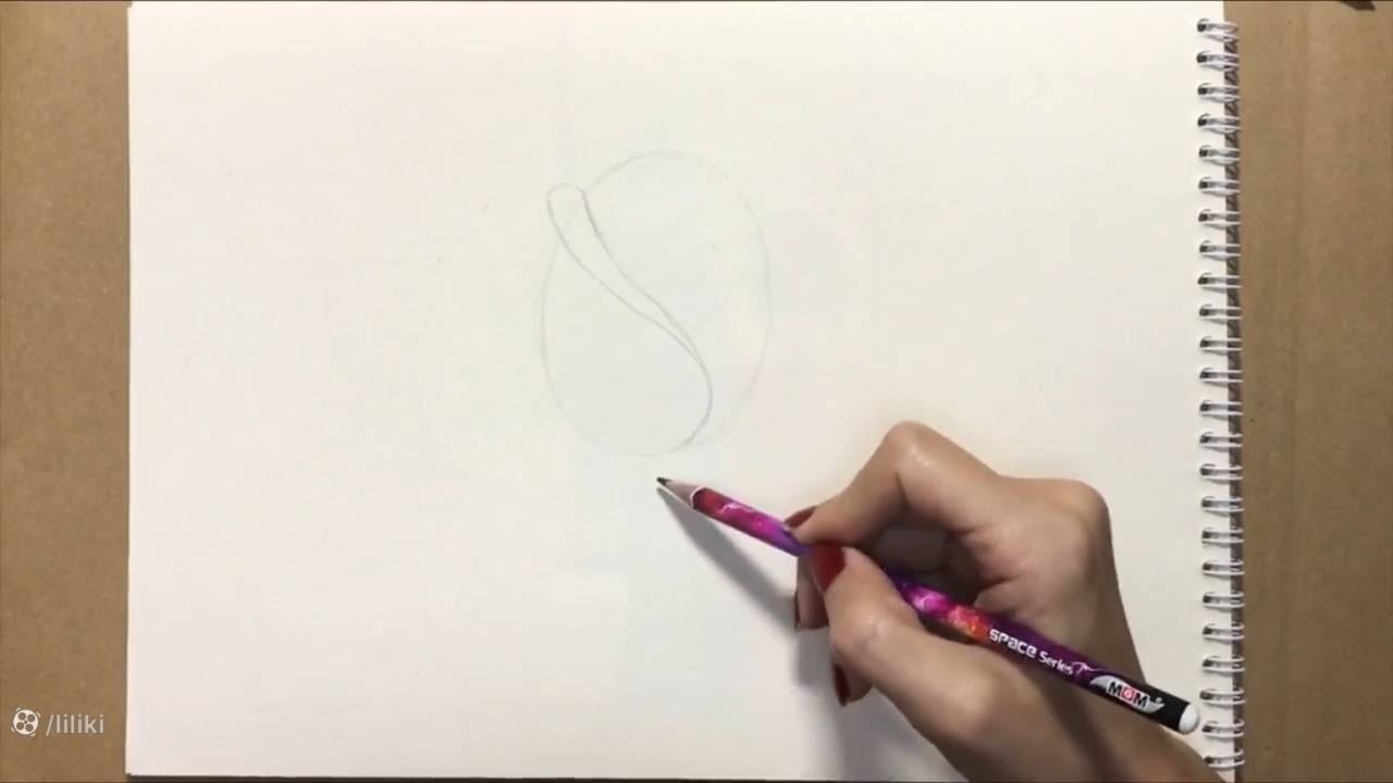 برای کشیدن طرح کلی گل اول دارم یه دونه بیضی می‌کشم. بعد از این سمت حالا می‌تونید این رو بسته به اینکه دوست دارین غنچه‌ش بازتر باشه یا بسته‌تر می‌تونید این کار رو خودتون تصمیم بگیرید از کدوم سمت جمع کنید و بیارید به این سمت.