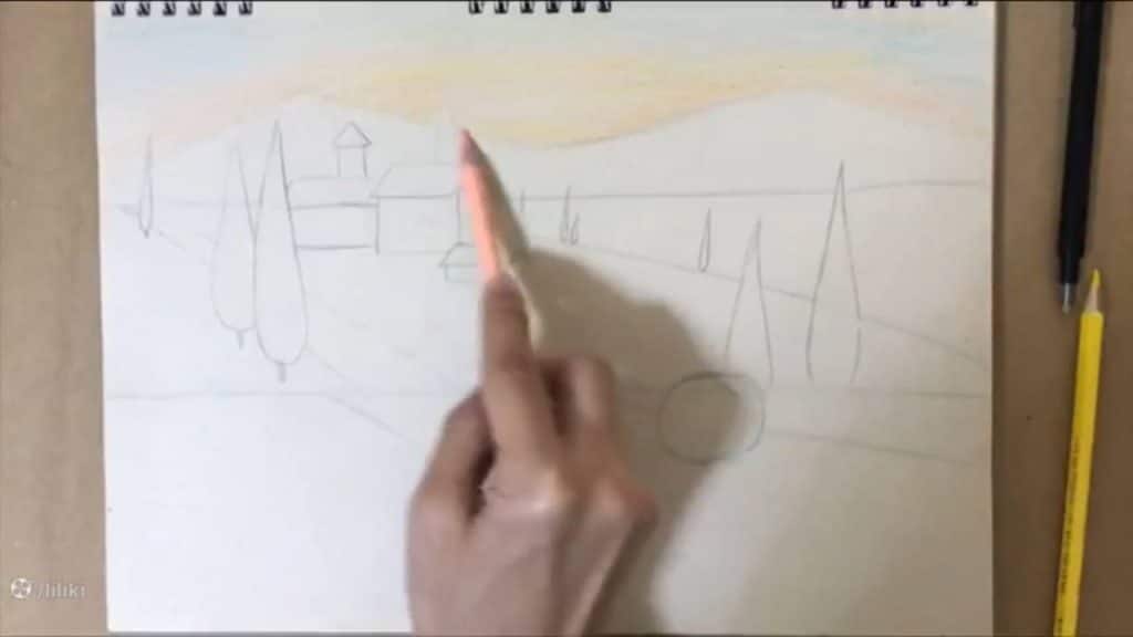 برای شروع نقاشی مزرعه حرفه ای من همیشه از مداد رنگی ام کیو استفاده میکنم. زرد شماره هفت رو برمیدارم و قبل از اینکه شروع کنم به رنگ آمیزی اول مطمئن میشم که این خطوطی که با مداد کشیدم به اندازه کافی کمرنگ هست یا نه. قراره که نقاشیمون یه مقداری غروب رو نشون بده به خاطر همین برای آسمونمون قراره از رنگهای زرد و نارنجی استفاده کنیم و بعد برسونیمش به آبی یه کوچولو زرد. مداد رنگیمو خوابوندم دارم زرد رو همینوری هر جایی که میتونم پر میکنم. خیلی نمیخوایم پر کنیم. بین این قسمتها دارم یه مقداری فضای خالی میذارم.