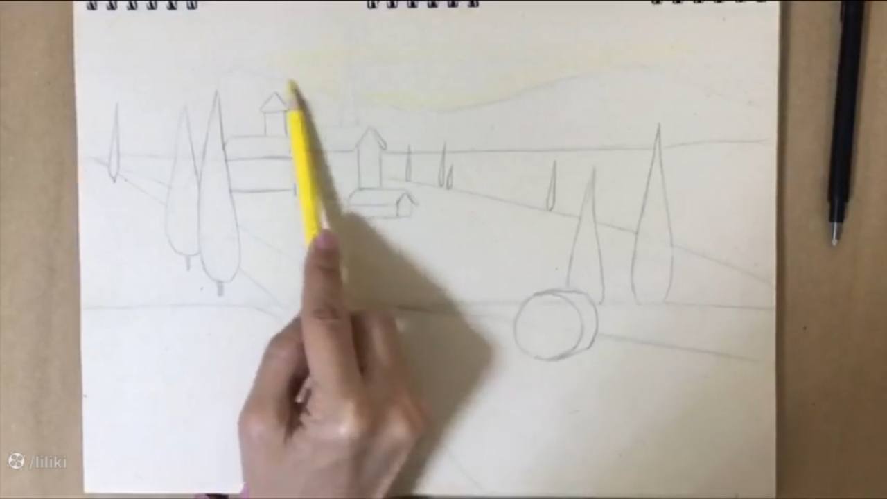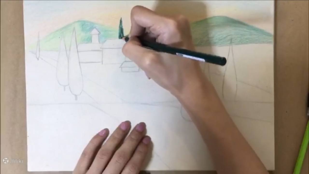 خب خب اینجا هم میخوام یه کوچولو درختهای محو بکشم که خیلی هم شکلاشون مشخص نیست. کلاً خیلی واضح نیستن. فرم درخت کشیدن رو هم که قبلاً بهتون یاد دادم برید نگاه کنید، هم توی سایت لیلیکی هست هم توی آپارات لیلیکی. هم توی درس طراحی پایه این رو یاد دادم و هم توی درس گام به گام مدادرنگی. هر دو تا از یک روش. هر کدوم که دوست داشتین میتونین نگاه کنید. هرچی میرسم به این قسمت یه کوچولو دارم ارتفاع درختامو کوتاهتر میکنم. مواظب باشید درختاتون همه یه اندازه نباشه. اگر هم توی خونهها اشتباهی رنگی رو آوردین حتماً پاکش کنید. اول کم رنگ بزنید بعد اگر نیاز شد میتونید یه مقداری دوباره پررنگش کنید. به همین سادگی.