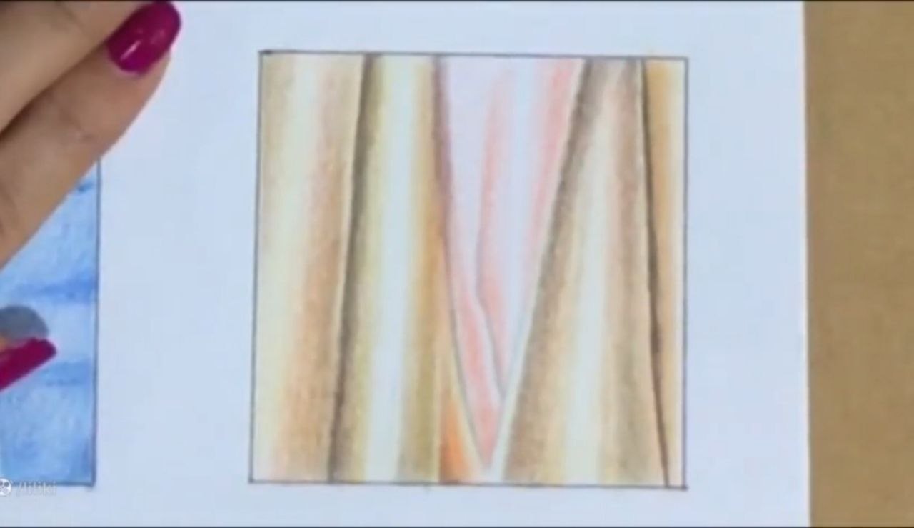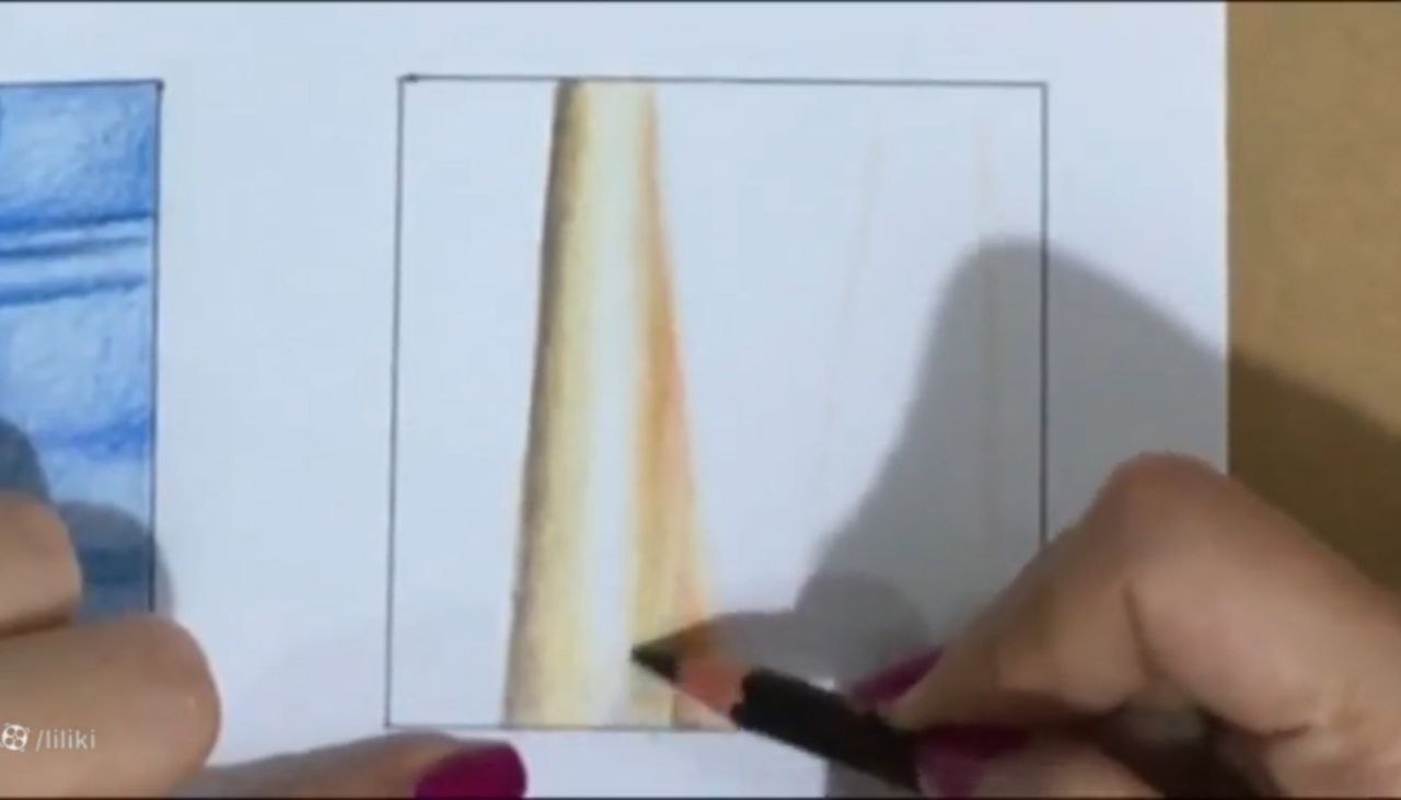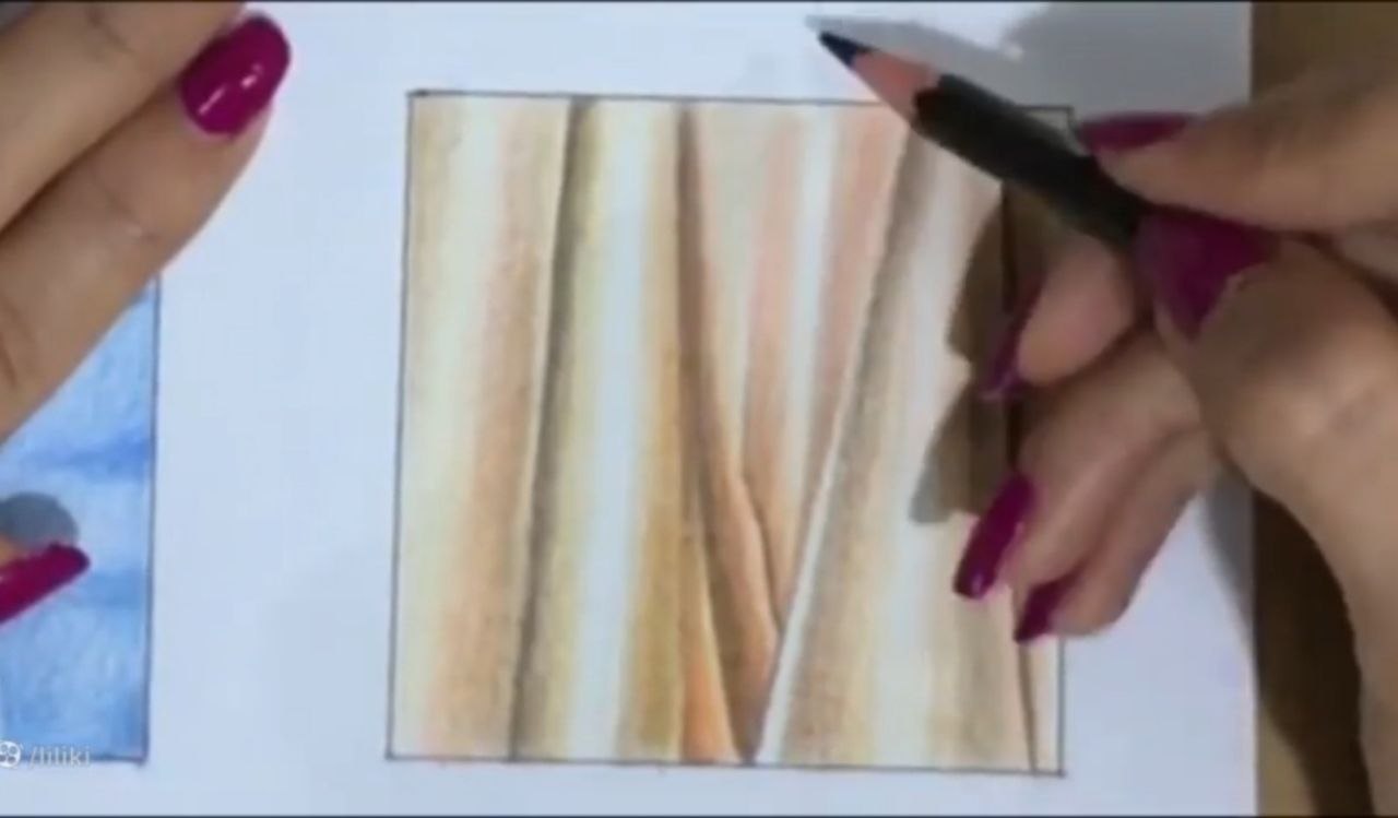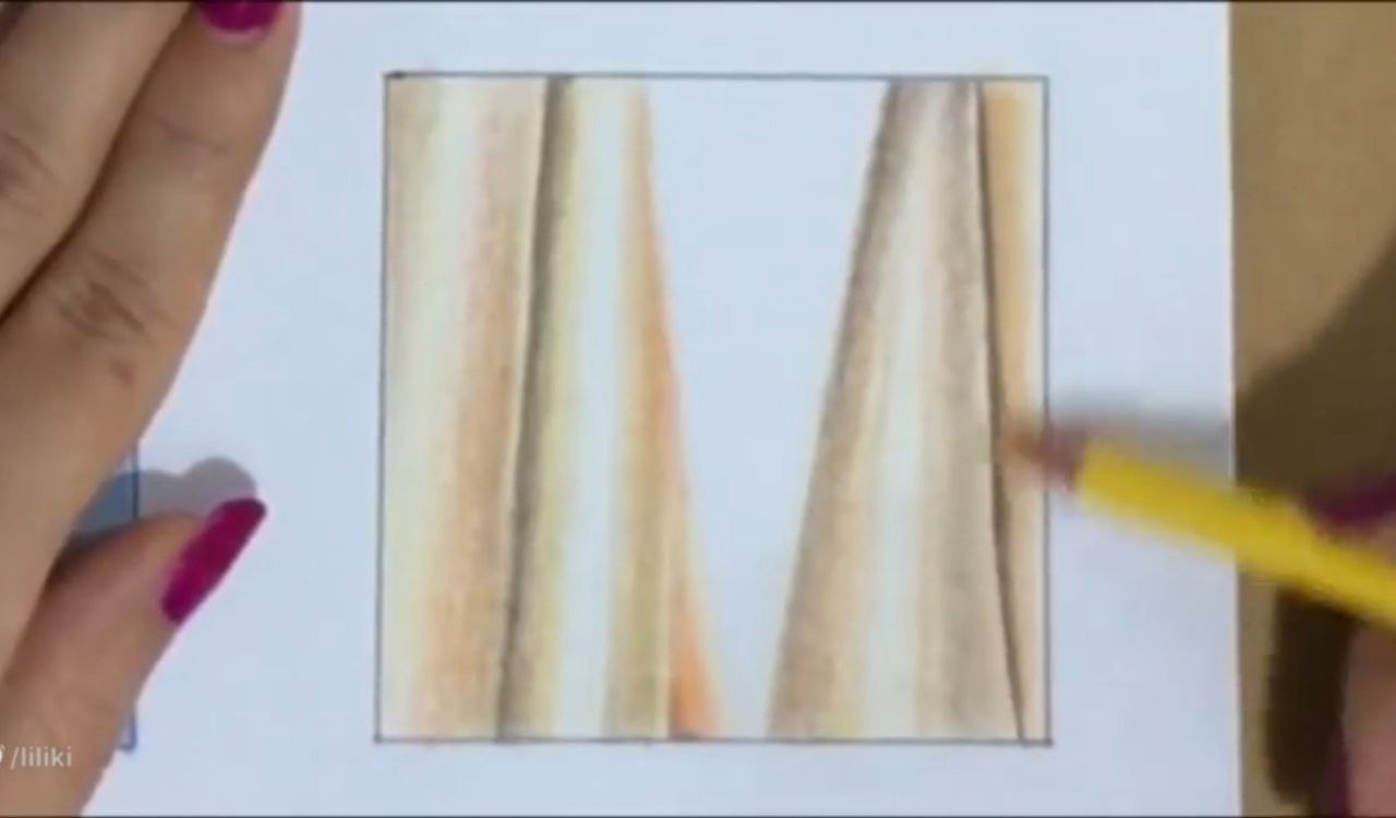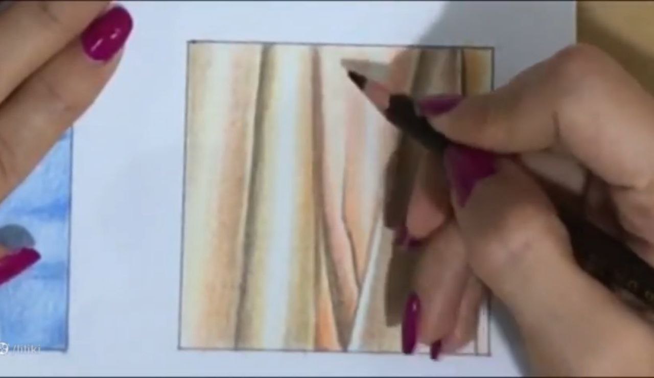 دوباره شماره ۵۹م رو دارم برمیدارم و از رنگش دارم استفاده میکنم یه مقداری روی اون تیرگیها این رنگ رو میزنیم مداد رو میخوابونیم خیلی کمرنگ چون میخوام اون هاله رنگ روشن روش باقی بمونه. از رنگ پوستم استفاده میکنم شماره ۱۶م روی تمام اون قسمتهایی که زده بودیم دوباره داریم تکرار میکنیم. میبینید من اینجا بین این تیرگی و این تیرگی شدید یه هاله روشنی قرار دادم و بعدش از زردم یه مقداری روش استفاده میکنیم. یه ذره اگر بیشتر بخوایم جزئیات اضافه کنیم که کارمون جذابتر بشه یه هالههای تیرگی من اینجوری میبینم بچهها؛ اگر میخواید صافِ خیلی صاف دربیارین میتونین از خطکش استفاده کنین ولی حواستون باشه که خیلی دیگه فشار دستتون زیاد نباشه از دستتون در نره.
