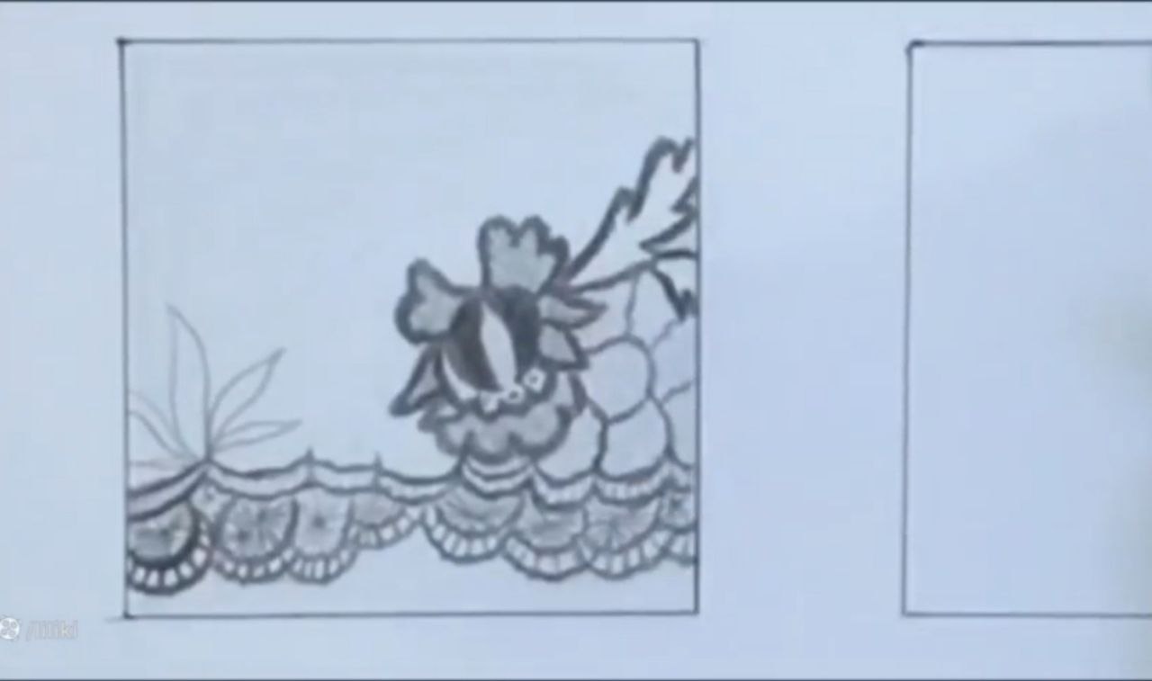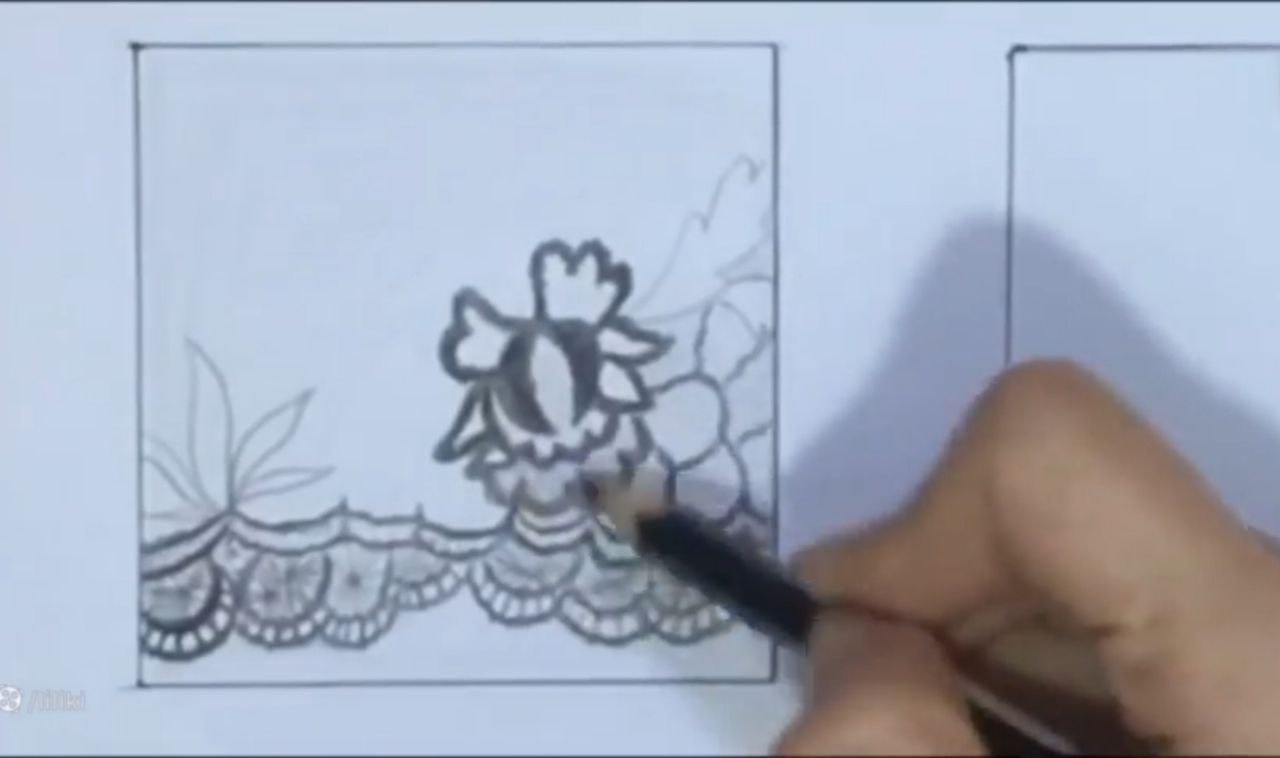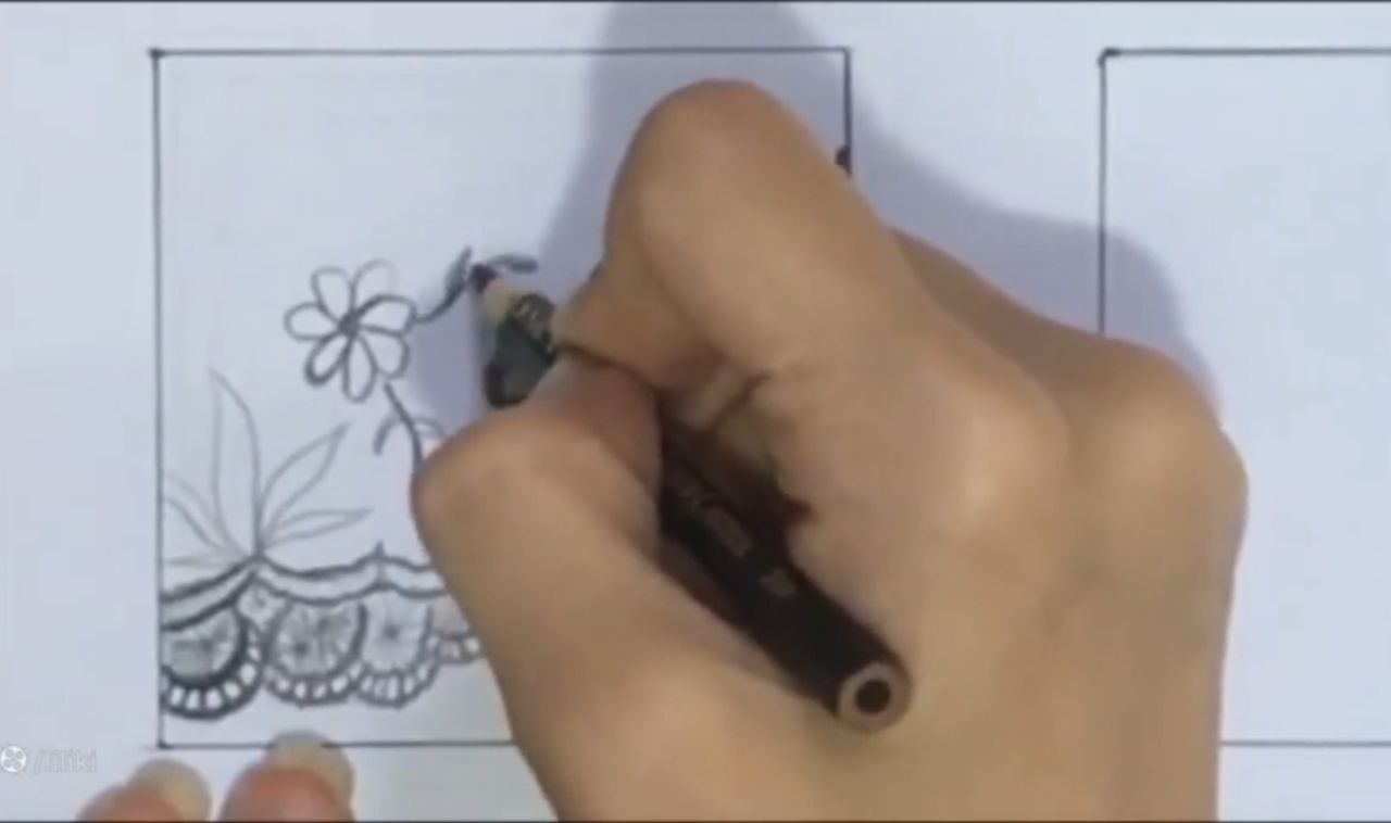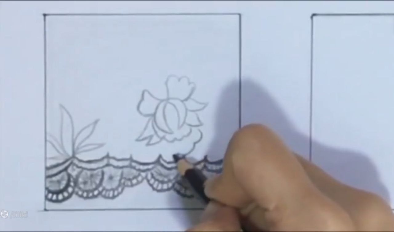 خب من اینجا ببینید دقیقا عین ابر توی نقاشی بچگیامون که میکشیدیم. اینجا یه چیز حدودی کشیدم. با فاصله از این میخوام بالاش حتی طرح توری رو هم. خودتون میتونید به سلیقه خودتون حالا یه تغییر بدید. یا یک مدل اصلا بذارید جلوتون و طبق مدل کار کنید. میتونید قبل از اینکه اصلا شروع کنید به اینکه بک گراندتون رو بزنید. طرح اولیه رو اول بکشید. بعد برید سراغ این مدل طرح زدن. خب من اینجا ببینید چهار تا خونه کار کردم. اینجا هم چهار تا خونه کار کردم. بالاش سه تا اینوری کار کردم. یه دونه اومدم به سمت پایین.