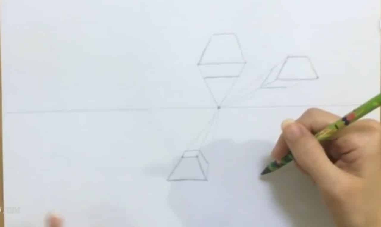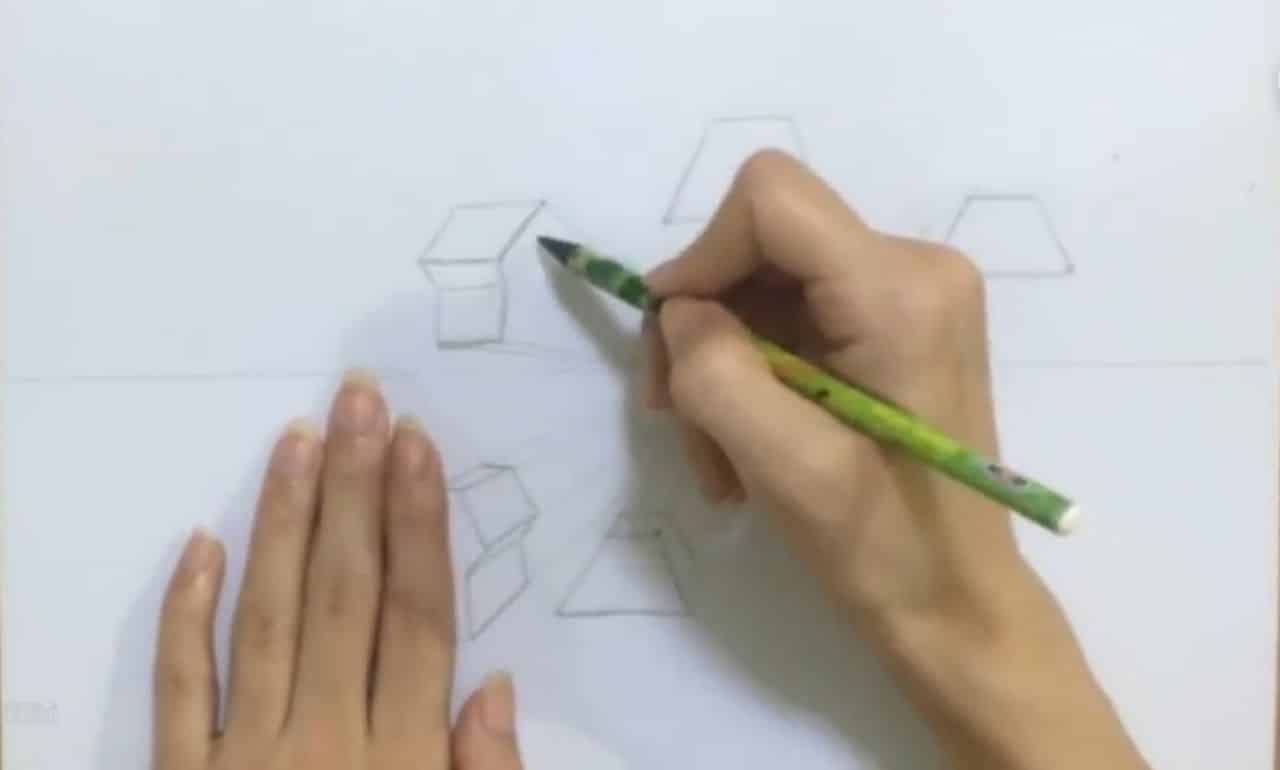 یه دونه هم برای مثال اینجا میکشم و بعد میریم اینجا یه دونه فیگور کامل میکشیم. حالا اینجا دوباره میخوام اول این قسمت جلو رو بکشم که ببینید توی این زاویه چه جوری در میاد. یه مقدار سعی میکنم خط هام موازی همدیگه باشه. اگر نبود پاک کنید و دوباره بکشید. دوباره به این شکل و دوباره یه مربع، یک مستطیل بیشتر از مربع استفاده میکنیم دوستان. از اینجا میام به سمت نقطه گریز، از اینجا هم به سمت نقطه گریز، و اینجا رو بذار یه خط صاف بذارم. از اینجا میام به سمت نقطه گریز. فرمی که اینجا دارم ببینید، این میشه کناره بدن و این هم میشه زیرش. به همین سادگی.