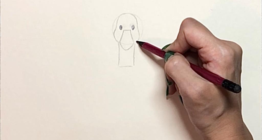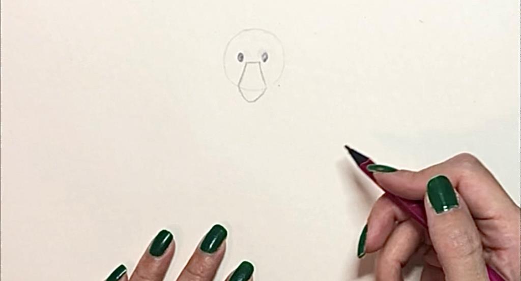 ابتدا برای کشیدن سر یک دایره رسم کنید. سپس چشم ها را با دو دایره توپر رسم کنید. برای کشیدن نوک یک نیم مثلث بکشید و در زیر آن یک نیم دایره بگذارید.