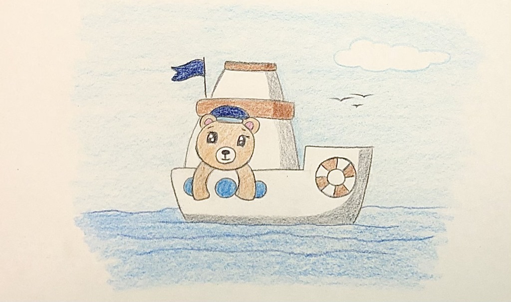 رنگ آمیزی نقاشی مان خیلی ساده است. ابتدا خرس را با رنگ قهوه ای روشن رنگ کنید. سپس کلاه خرس، پرچم و پنجره های کشتی را با رنگ آبی رنگ کنید. حالا مطابق شکل کشتی را رنگ کنید و سایه بزنید. پس از آن زیر کشتی با رنگ آبی آب دریا را بکشید و بعد آسمان و ابرها را رسم کنید. به همین سادگی.