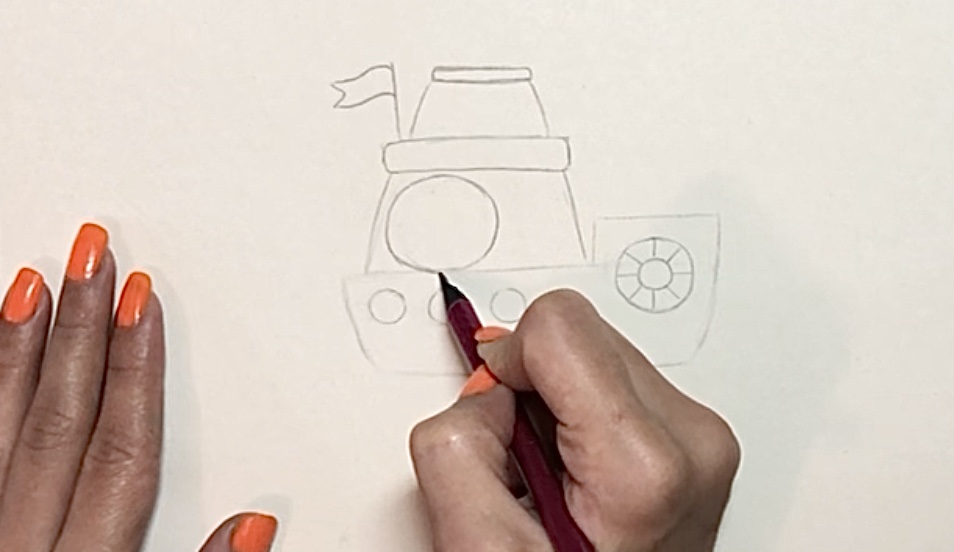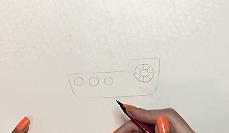 برای کشیدن این نقاشی ابتدا کشتی را می کشیم. اول یک شکل گلدان مانند پهن می کشیم. سپس یک مشتطیل در بالا گوشه راست می کشیم. حالا به وسیله سه دایره پنجره های کشتی را رسم می کنیم. برای کشیدن تیوپ نجات هم دو دایره یکی بزرگ و یکی کوچک درون هم می کشیم. سپس درون آن را با یک ضربدر و به علاوه تقسیم می کنیم.