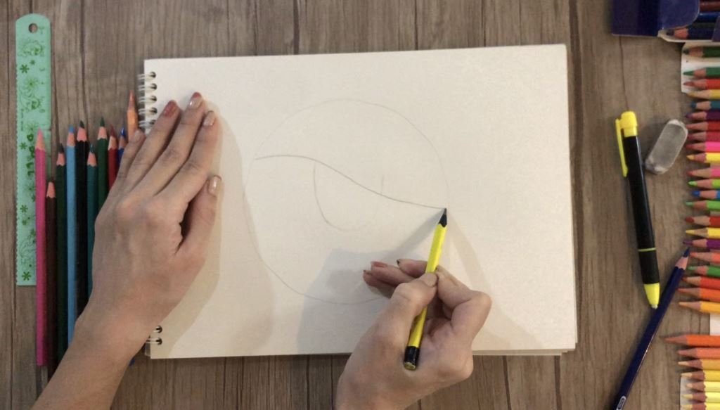 ابتدا یک دایره می کشیم. برای کشیدن دایره می توانید از یک ظرف گرد کوچک مانند نعلبکی استفاده کنید. سپس دایره را به وسیله یک خط منحنی مانند شکل زیر به دو نیم تقسیم می کنیم. در زیر منحنی به وسیله یک نیم دایره صورت نقاشی دختر زیبا یمان را می کشیم.