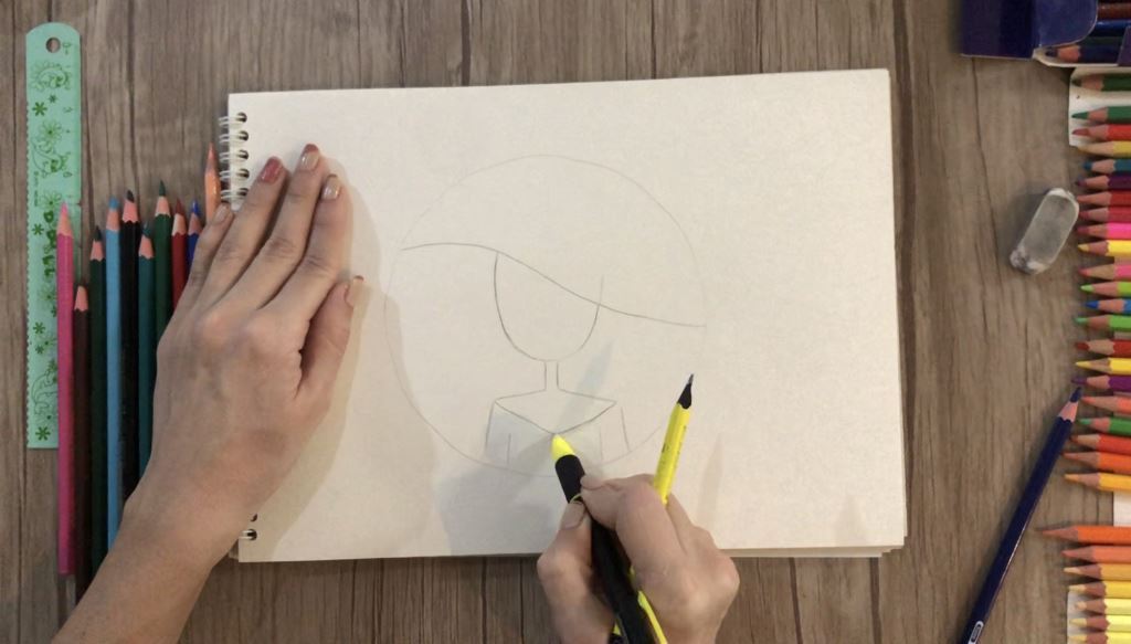 بتدا با دو خط عمودی گردن را رسم می کنیم. با دو خط مورب شانه ها و دوباره با خطوط عمودی دست ها را می کشیم. سپس به عنوان یقه یک مثلث می کشیم.