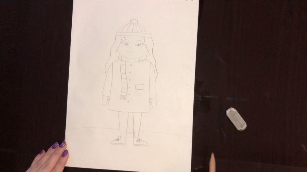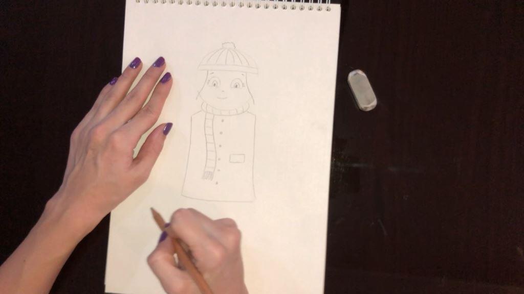 برای کشیدن بدن نقاشی دختر از یک مستطیل استفاده می کنیم. حالا می توانید برای قسمت آویزان شال گردن را با یک مستطیل رسم می کنیم و در پایین آن ریشه های شال گردن را با استفاده از بیضی های باریک می کشیم. برای کشیدن جیب از یک مستطیل خوابیده کوچک کمک می گیریم. سپس دکمه های لباس دخترک را با نقطه های درشت سیاه می کشیم.