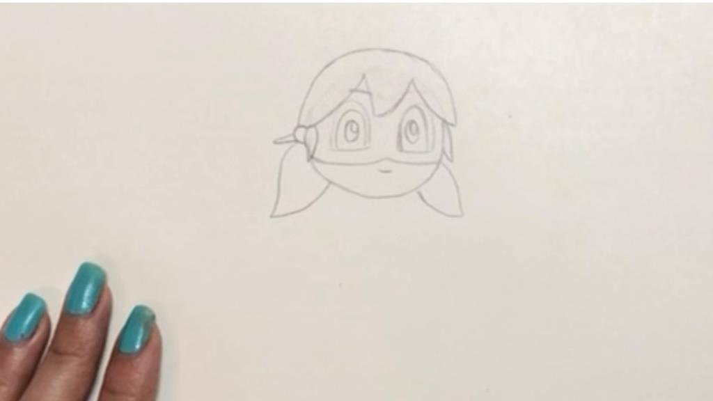 برای کشیدن مو های روی سر از سه مثلث استفاده می کنیم. برای کشیدن دو گوشی ها دو شکل برگ مانند در دو طرف سر می کشیم. برای کشیدن قسمت کش مو هم از دایره و شکل برگی در محل قرارگیری گوش ها استفاده می کنیم.