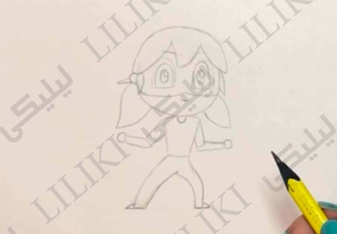 برای کشیدن یقه یک نیم دایره زیر صورت می کشیم. سپس برای بدن یک شکل گلدان مانند متصل به صورت و گردن ترسیم می کنیم. برای کشیدن شلوار از دو مستطیل کشیده مایل استفاده می کنیم. هرچه به پایین شلوار نزدیک می شویم خطوط مستطیل را به هم نزدیک تر کنید تا پایین شلوار تنگ تر شود. کفش ها را با دو نیم بیضی رسم کنید.