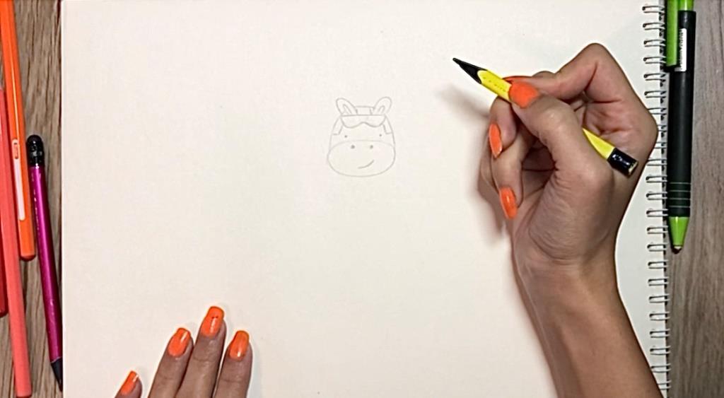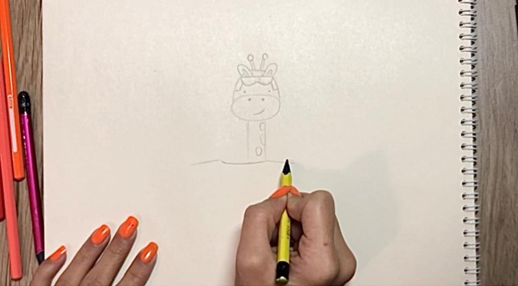 ابتدا برای کشیدن سر زرافه یک بیضی خوابیده می کشیم. سپس یک نیم بیضی بالای این بیضی رسم می کنیم. حالا گوش ها را هم با کمک دو بیضی می کشیم. برای کشیدن عینک خلبانی از دو نیم دایره به هم چسبیده استفاده کنید. حالا به عنوان چشم و بینی دو نقطه بگذارید.
