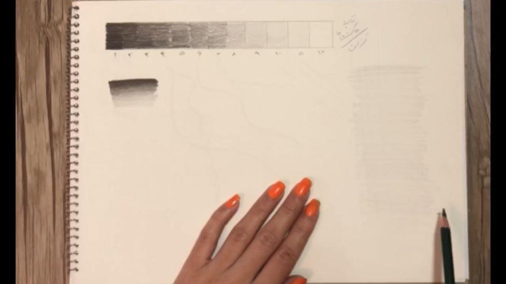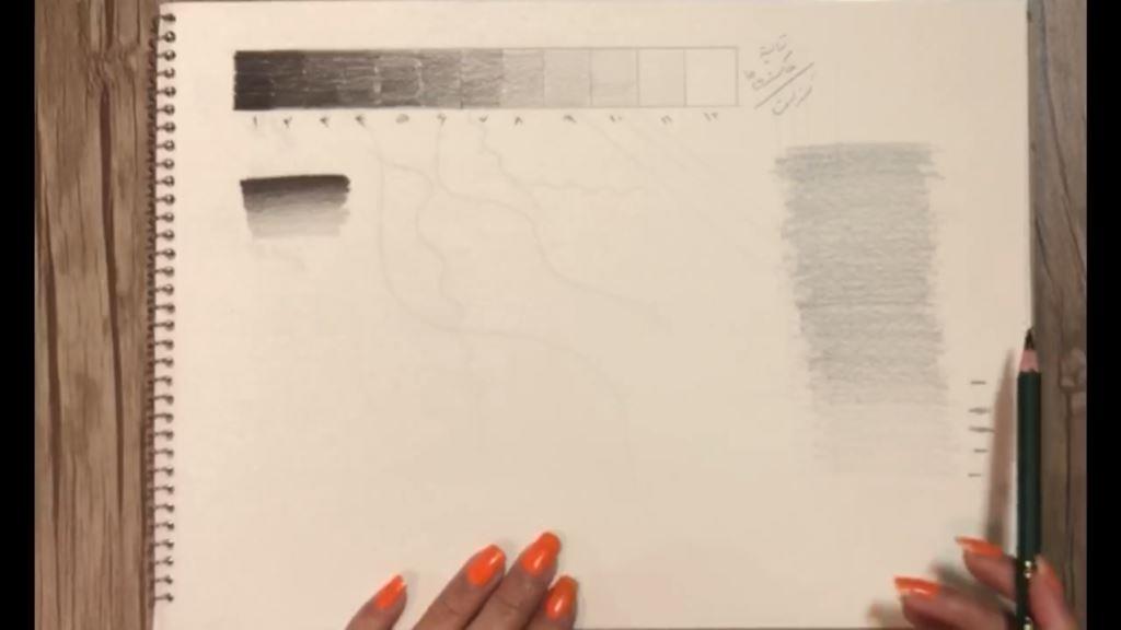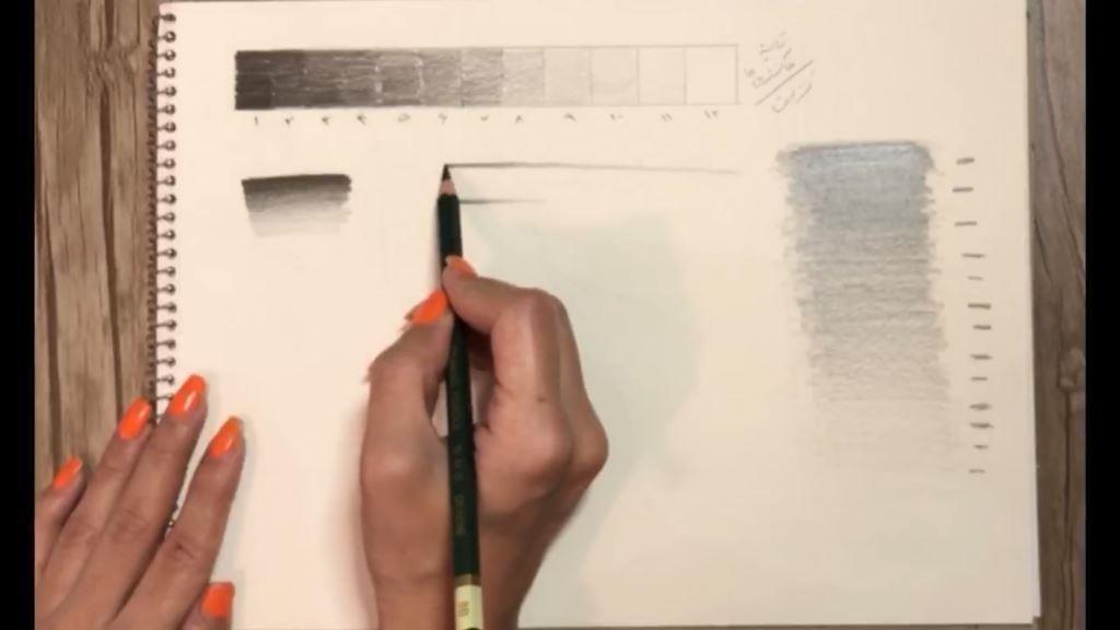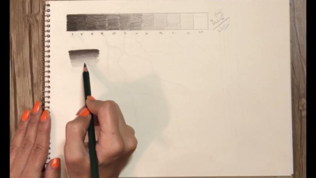 در این تمرین شما باید ابتدا مداد را روی کاغذ فشار دهید و تیره ترین رنگ را بکشید و هرچه به پایین نردیک تر می شوید فشار را کمتر می کنید تا به سفیدی برسید. در این تمرین باید فشار دستتان به مرور کم شود. نباید جدایی بین رنگ ها بیفتد و باید به صورت پیوسته از تیره به روشن برسید.