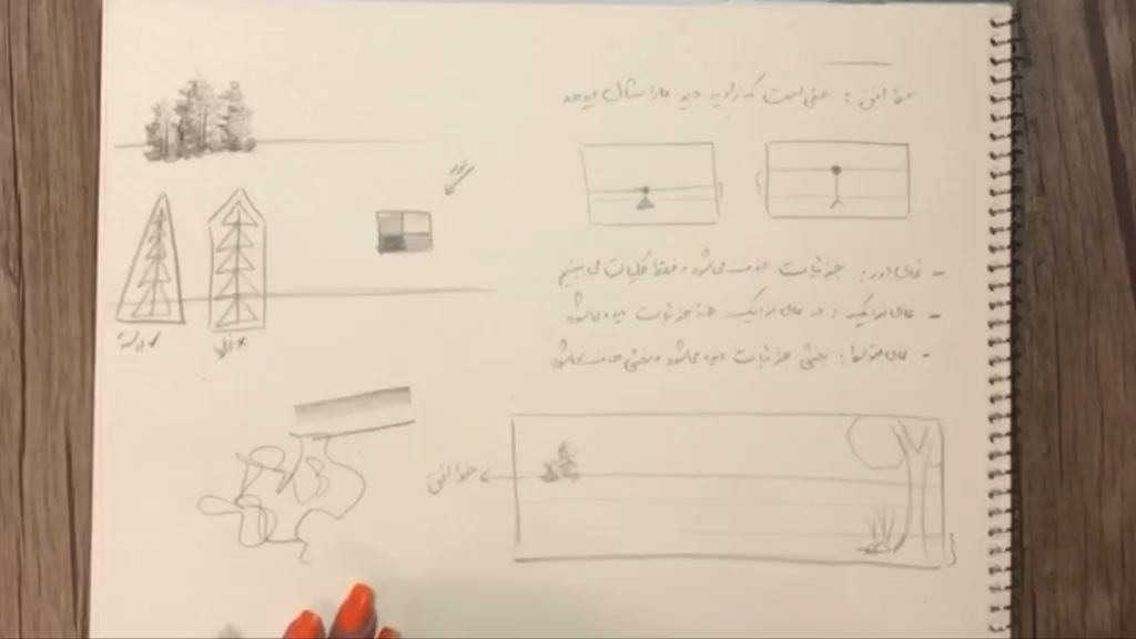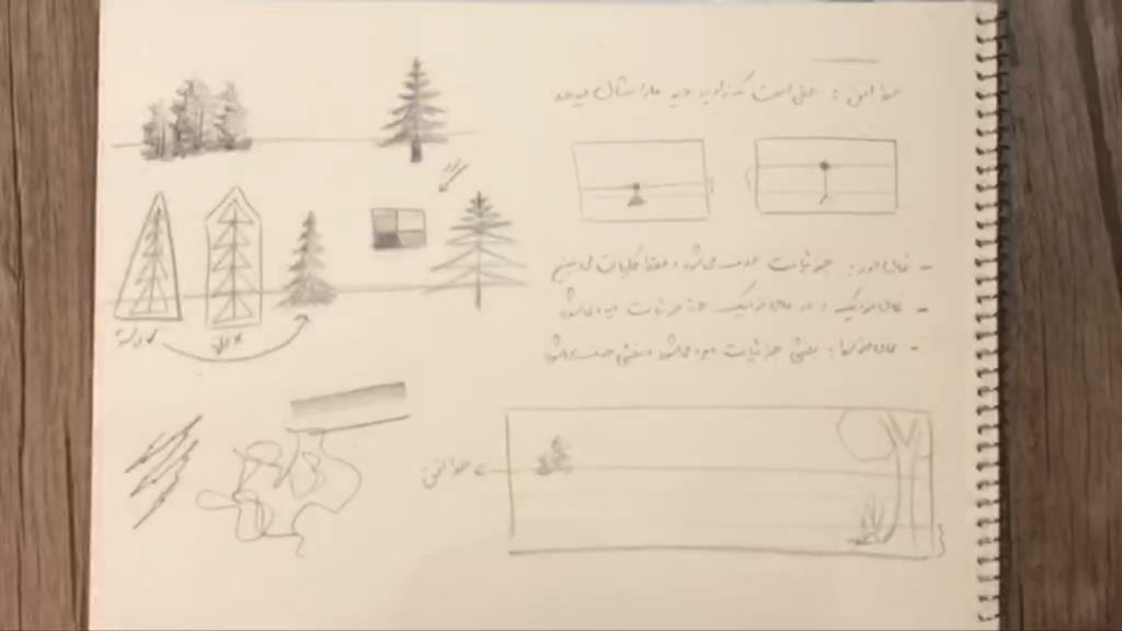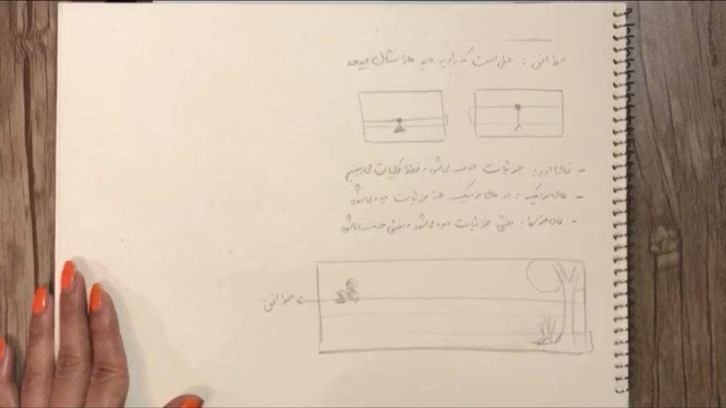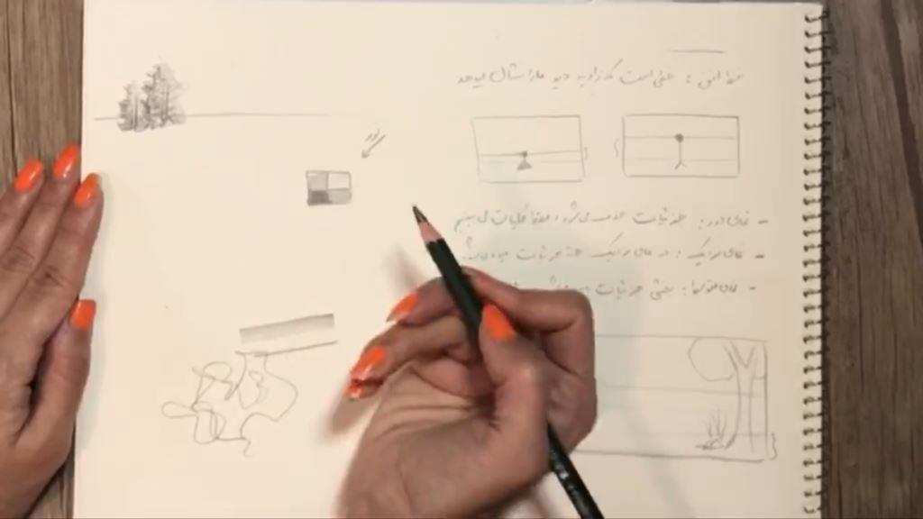 پس اگر خواستید در قسمت پایین کادر درخت بکشید باید درخت را بزرگ تر بکشید. و در دوردست می توانید به خط افق نزدیک تر بکشید. وقتی درخت را نزدیک تر می کشیم باید جزئیات را بکشیم. یعنی تمامی خطوط و نور و سایه را رعایت کنیم.