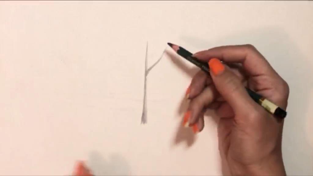 ابتدا شکلی شبیه یک مثلث خیلی باریک یا شمشیر می کشیم. باید نور سایه آن را هم رعایت کنیم. حالا به این تنه باید شاخه اضافه کنید. توجه داشته باشید که شاخه خیلی پیچ و تاب نداشته باشد. محل اتصال این شاخه به شاخه قبل کمی کلفت تر و هرچه به سمت سر می رود نازک تر شود.