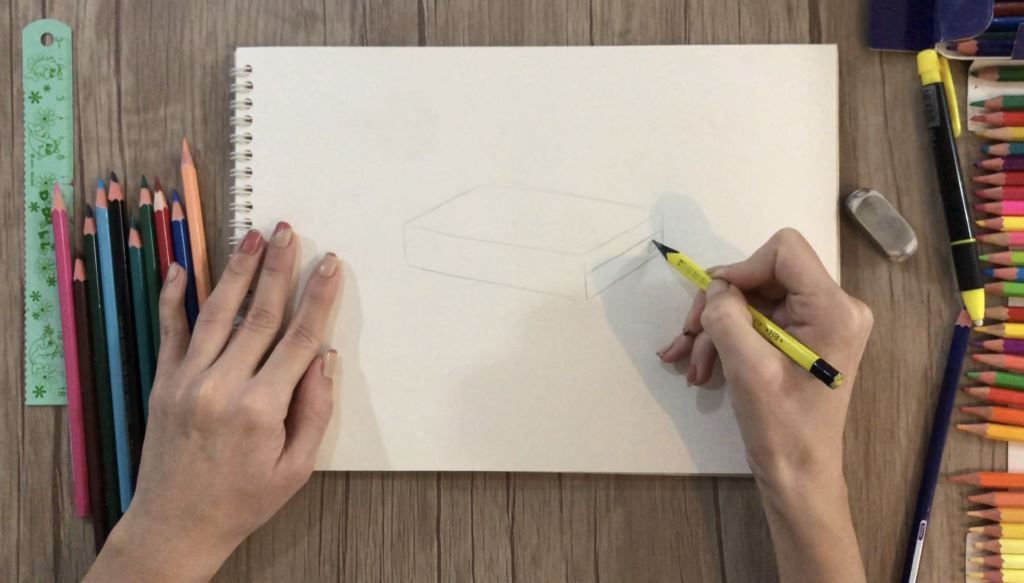 ابتدا یک مکعب می کشیم. سپس قسمت جلوی مکعب را به دو نیم تقسیم می کنیم. تقسیم بندی پایین محل قرار گیری چراغ ها است.