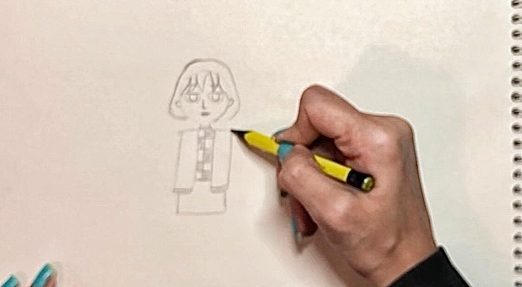 برای کشیدن بالاتنه یک شکل گلدان مانند با خط مایل و افقی می کشیم. در زیر گردن با یک مثلث یقه را رسم می کنیم. سپس از زیر مثلث یک خط عمودی می کشیم. حال برای کشیدن شلوار از مستطیل استفاده کنید. سپس در وسط مستطیل یک خط عمودی بکشید و شلوار را تکمیل کنید.