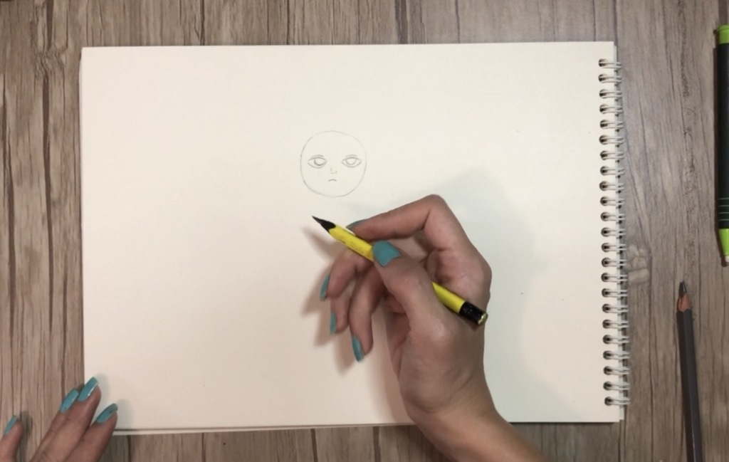ابتدا یک برای کشیدن صورت یک دایره رسم می کنیم. برای کشیدن چشم ها از دو خط منحنی که به شکل برگ باشد استفاده می کنیم. سپس درون آن نیم دایره می کشیم. برای کشیدن بینی باید از یک نیمه مثلث استفاده کنیم.