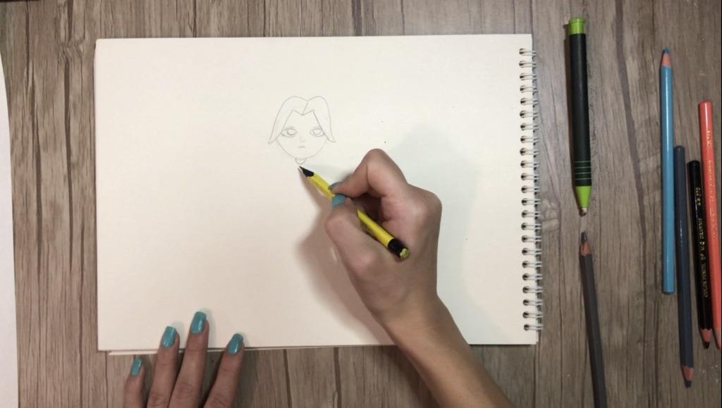 برای کشیدن موها ابتدا بالای پیشانی یک مثلث شبیه عدد هفت می کشیم و یک خط عمودی در وسط آن رسم می کنیم. سپس بالای آن دوباره یک شکل عدد هفت را رسم می کنیم. حالا از دو طرف شکل هفت خط منحنی به سمت پایین می کشیم و یک شکل مثلثی به دست می آوریم. برای گردن نیز از یک نیم دایره در زیر صورت استفاده می کنیم.