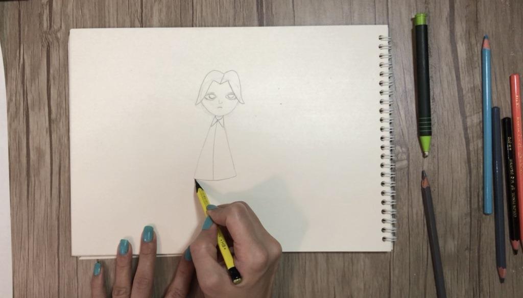 در زیر نیم دایره گردن دو مثلث کوچک می کشیم. و در ادامه آن ها به عنوان بدن یک مثلث رسم می کنیم. حالا در وسط بدن یک خط عمودی بکشید.