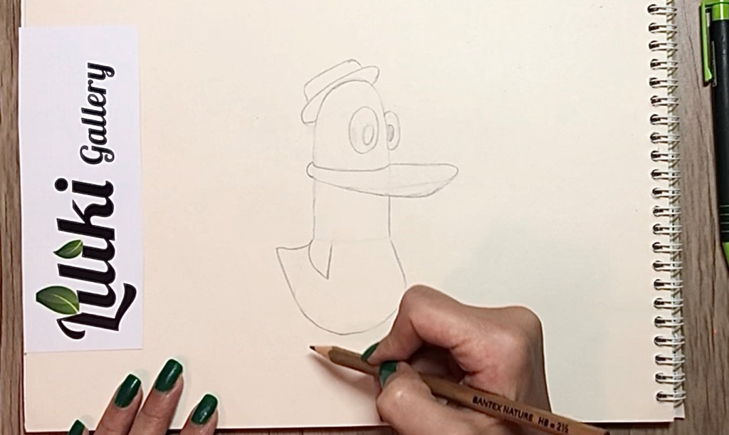 برای کشیدن چشم ها باید دو بیضی تو در تو بکشید. حواستان باشد که چشم راست بیرون زده باشد. حالا با کمک بیضی و مستطیل کلاه را روی سر پاتو بکشید.
