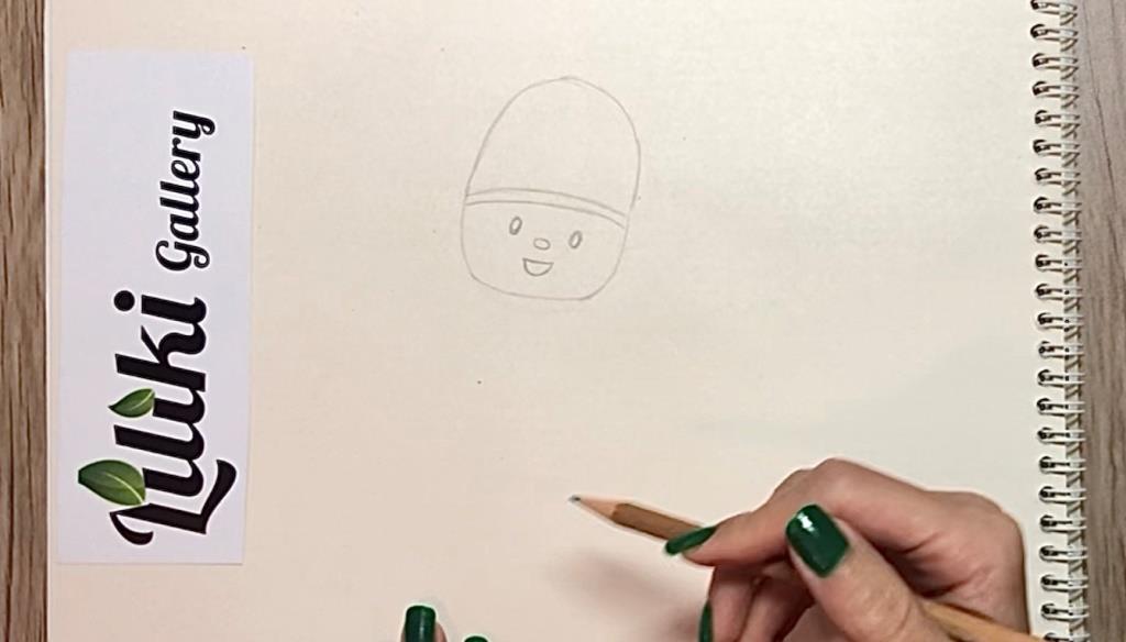 ابتدا یک برای کشیدن سر یک بیضی رسم می کنیم. سپس در وسط بیضی دو خط می گذاریم تا صورت و کلاه را جدا کنیم. حالا برای چشم ها و بینی بیضی های کوچک می کشیم. سپس دهان را با یک نیم دایره رسم می کنیم.