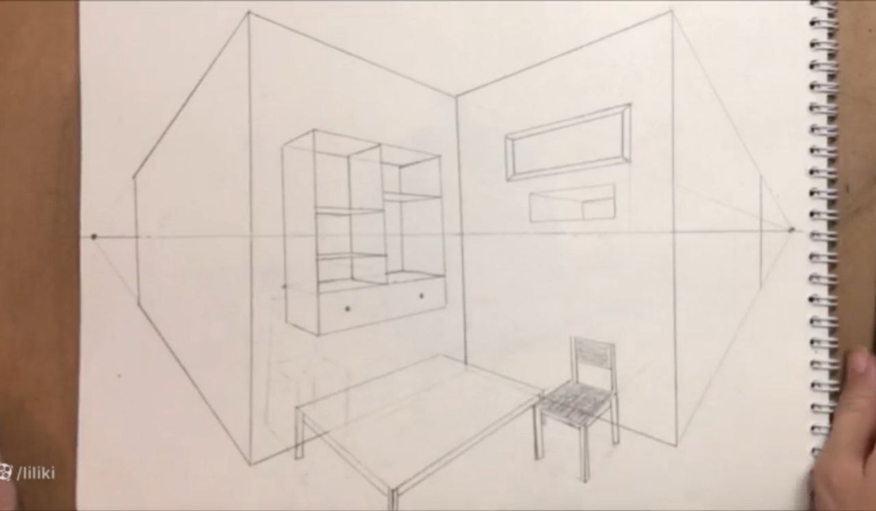 کشیدن کتابخونه و قوانین پرسپکتیو دو نقطه اتاق