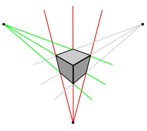 باید بدانید که پرسپکتیو سه نقطه ای دارای سه نقطه گریز است. دونقطه ی آن در سمت چپ و راست خط افق و نقطه گریز سوم با توجه به موقعیت ناظر یا در بالای خط افق و یا در پایین این خط واقع می شود.