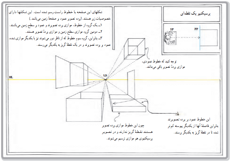 در کتاب مناظر و مرایا درباره پرسپکتیو تک نقطه ای آمده است: اگر یکی از اضلاع یا قطرهای اصلی شی موازی پرده تصویر شد، یک نقطه به حساب می آید.