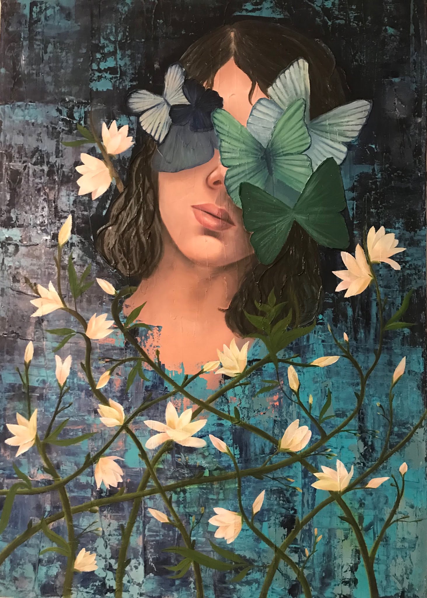 در تابلو نقاشی رنگ روغن زنانگی در ابتدا چشم ها خیره به پروانه های روی صورت زن می شود که با بال هایی باز بر روی صورت زن نشسته اند و دور تا دورش پیچک هایی که گل هایی سفید بر آن روییده می بینید.