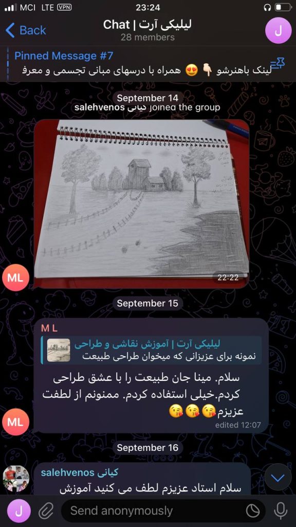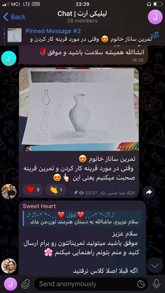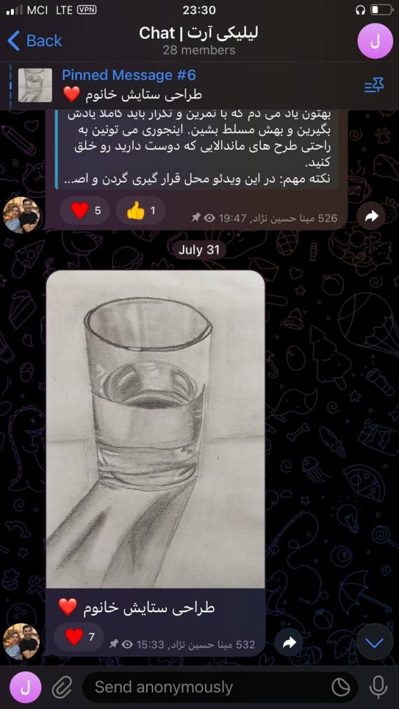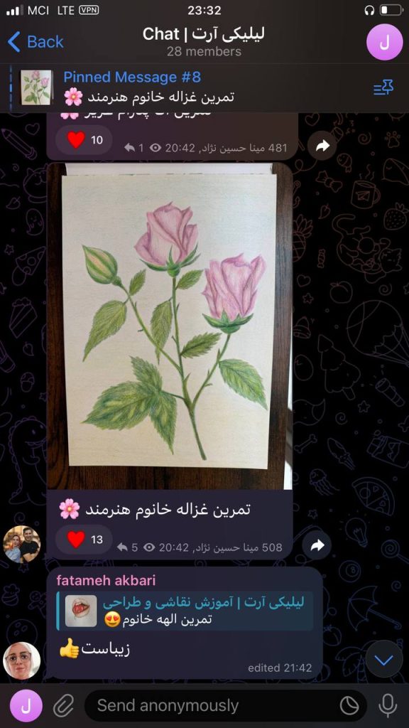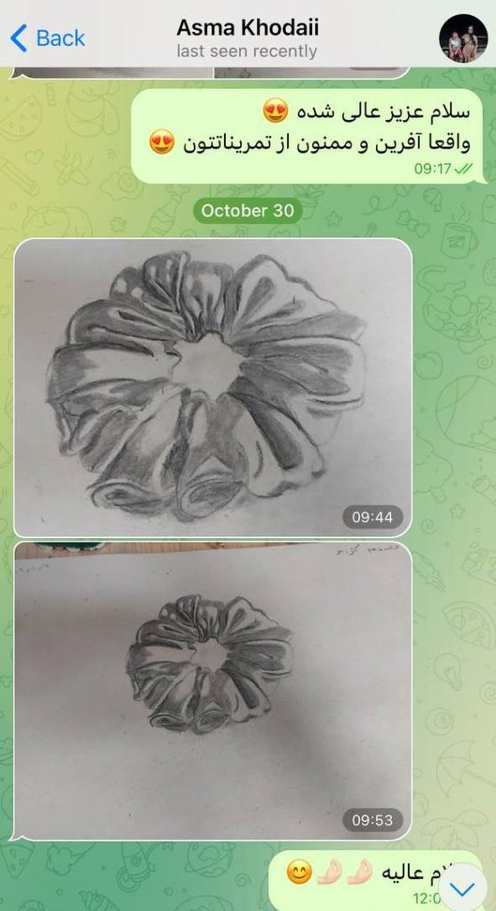 حالا با وجود این منبع ارزشمند از آموزش‌هاو راهنمایی های من، فقط تلاش و پشتکار علاقمندان نیاز بود تا نتایج حاصل شوند. خدا را هزاران مرتبه شکر هر روز شاهد افزایش هنرجویان دوست داشتنی لیلیکی، ارسال تمرینات و موفقیت های شما دوستان در یادگیری نقاشی هستم. به همین دلیل این احساس خوب از انجام رسالتم و حال خوب هنرجویانم از موفقیت هایشان را در این صفحه با شما به اشتراک می‌گذارم.