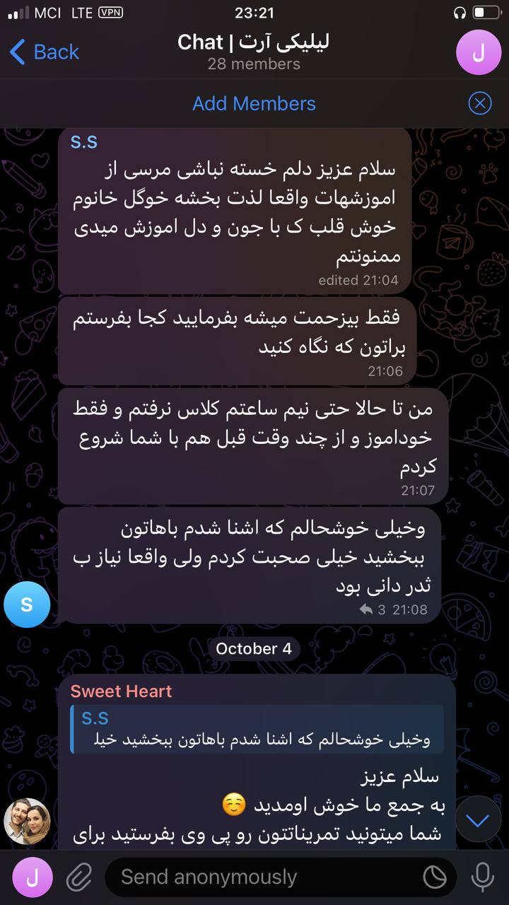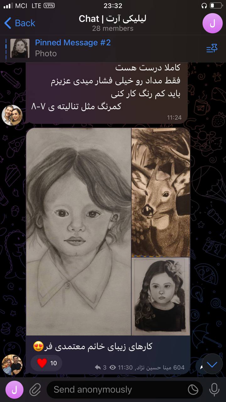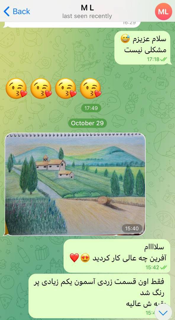 حالا با وجود این منبع ارزشمند از آموزش‌هاو راهنمایی های من، فقط تلاش و پشتکار علاقمندان نیاز بود تا نتایج حاصل شوند. خدا را هزاران مرتبه شکر هر روز شاهد افزایش هنرجویان دوست داشتنی لیلیکی، ارسال تمرینات و موفقیت های شما دوستان در یادگیری نقاشی هستم. به همین دلیل این احساس خوب از انجام رسالتم و حال خوب هنرجویانم از موفقیت هایشان را در این صفحه با شما به اشتراک می‌گذارم.